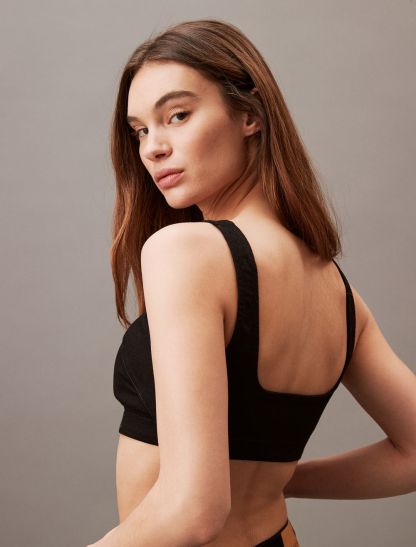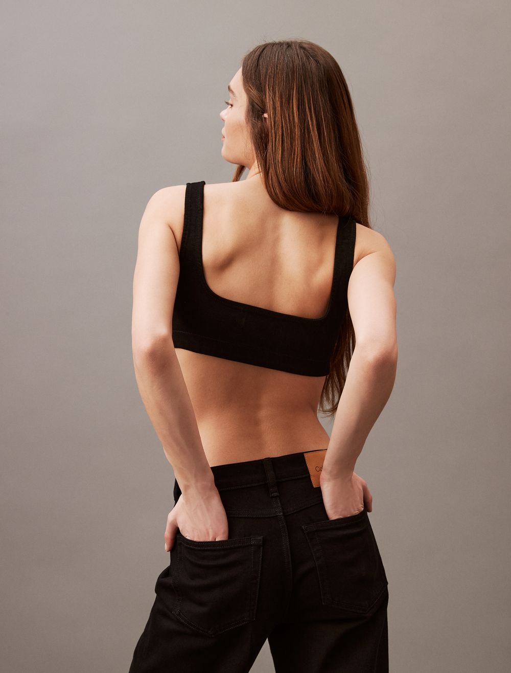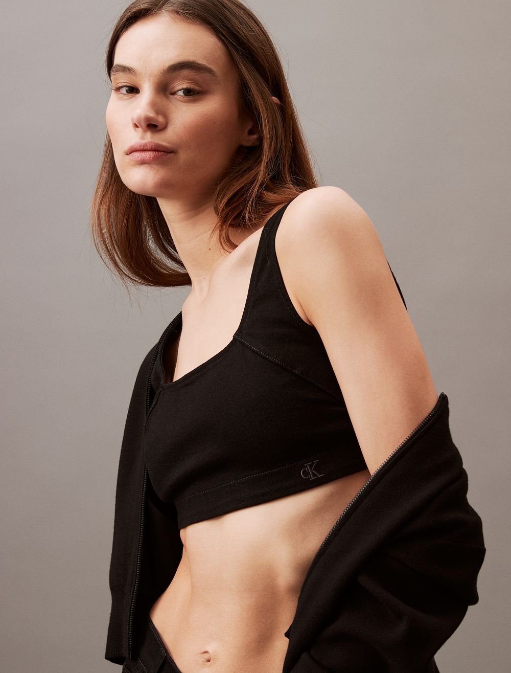 Crafted from cotton-stretch denim, this bra is detailed with seaming lines for defined shape. Made with a flattering, fitted silhouette. Styled with a square neckline and finished with an embroidered CK monogram logo at the underband.- Sleeveless silhouette + square neckline
