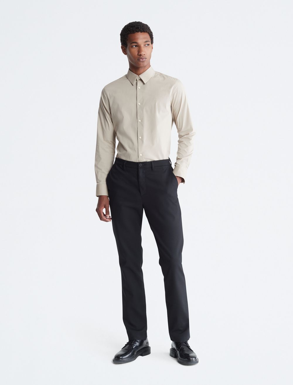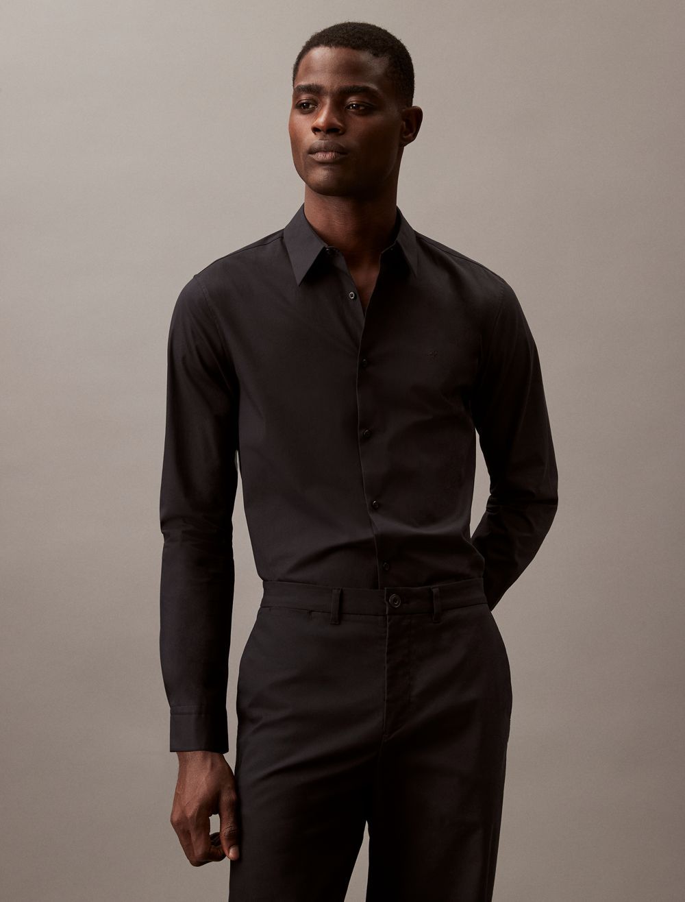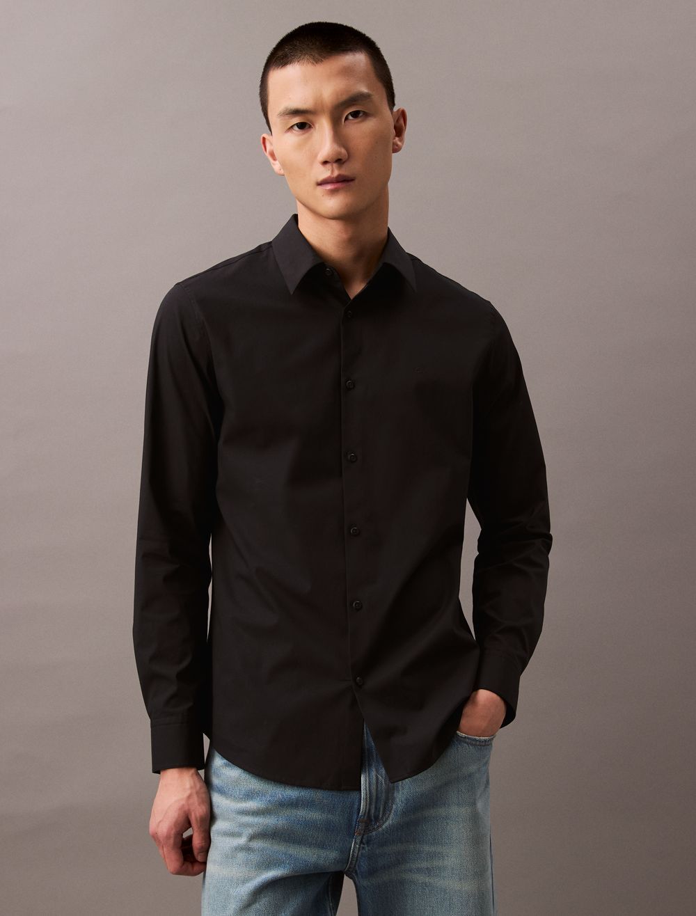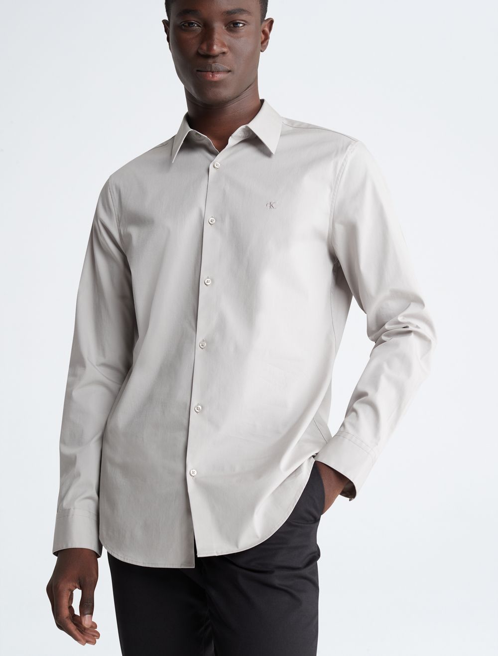 Tailored and refined, this long sleeve woven shirt is made with a solid design in an extra soft cotton stretch blend. Designed with an embroidered monogram logo at the chest for an iconic look, button-front closures and barrel cuffs for an elevated and versatile Calvin Klein button-down essential.- Provides ultimate comfort by stretching as you move