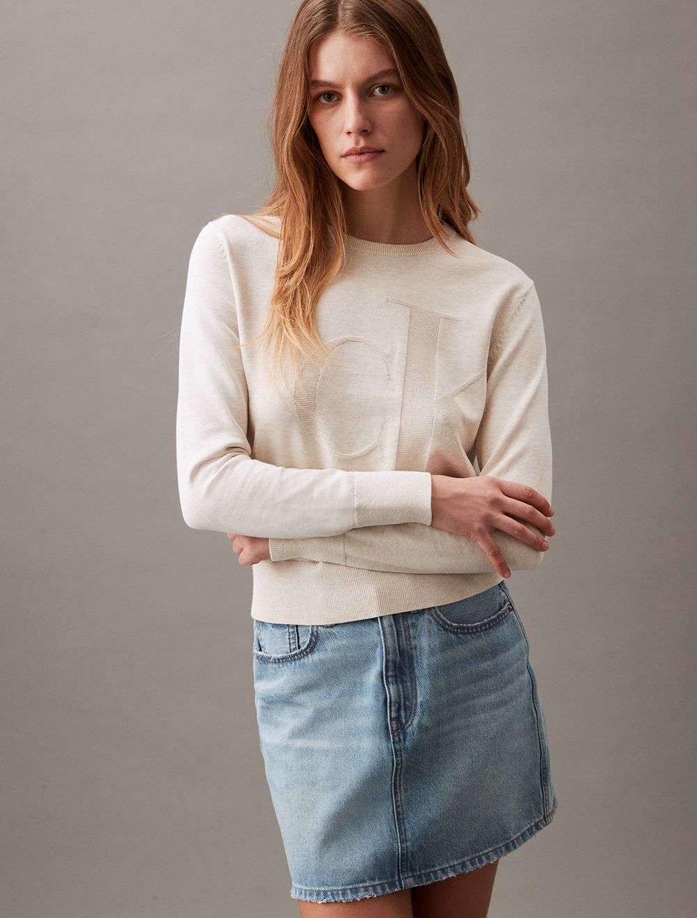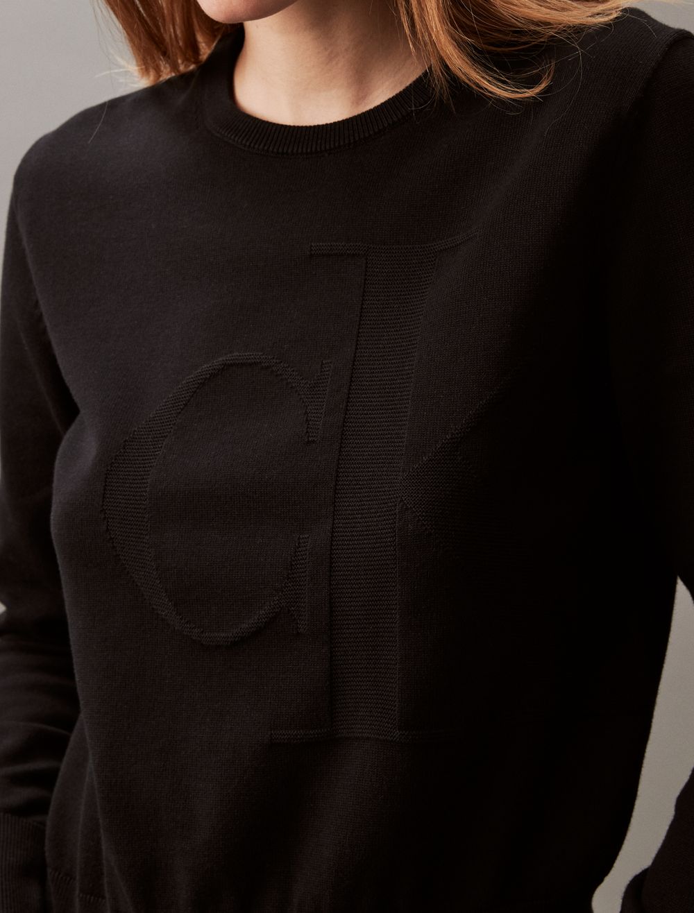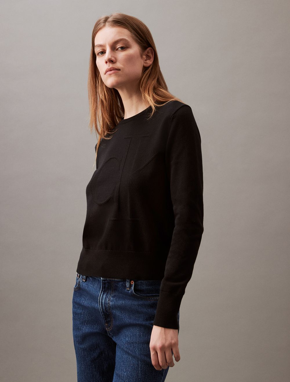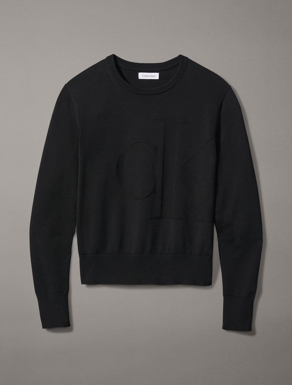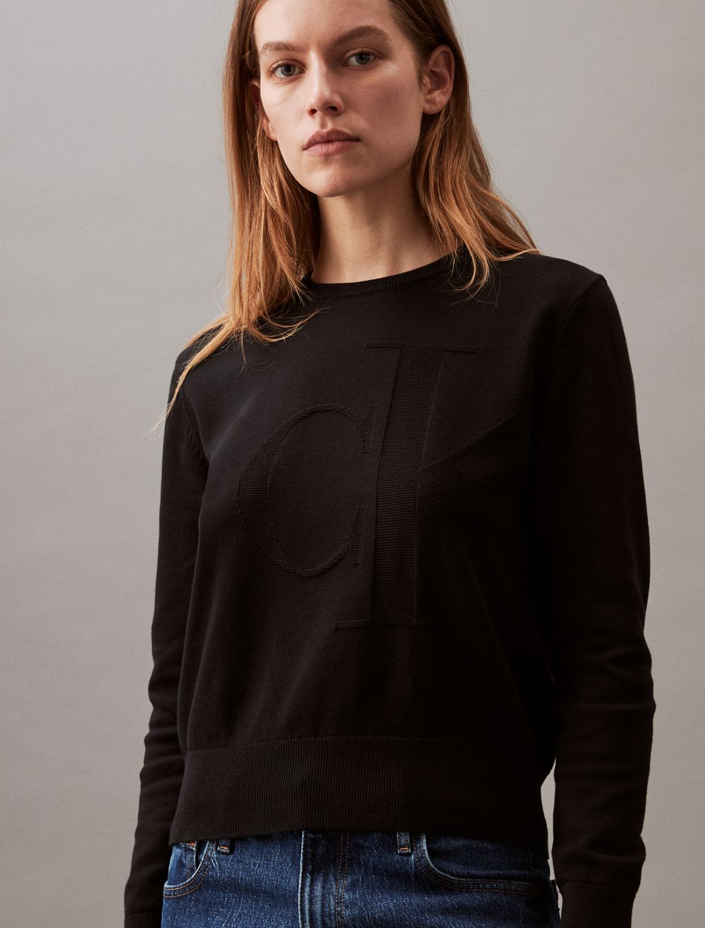 Crafted from compact cotton for a smooth hand with an extra sleek feel, this sweater features a textured CK monogram logo design at the front. Made with long sleeves and a crewneck. Finished with ribbed styling at the cuffs and hem.- Smooth compact cotton for effortless, extra sleek comfort