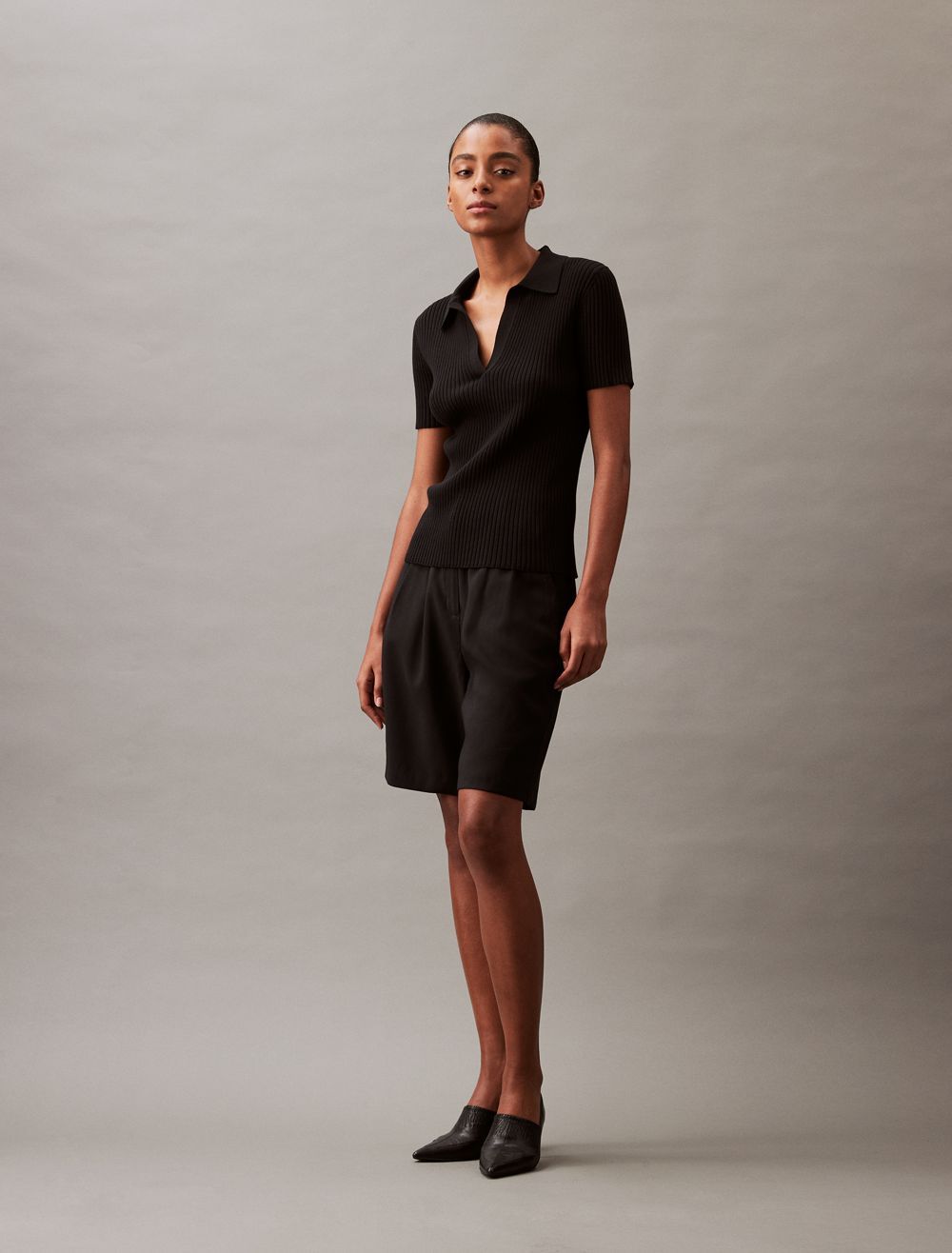 - Short sleeves + open polo collar