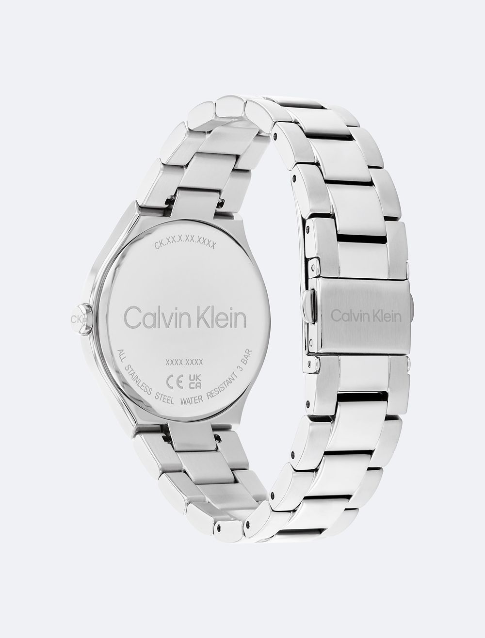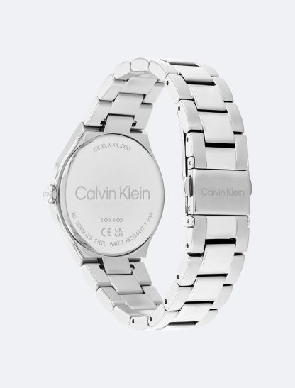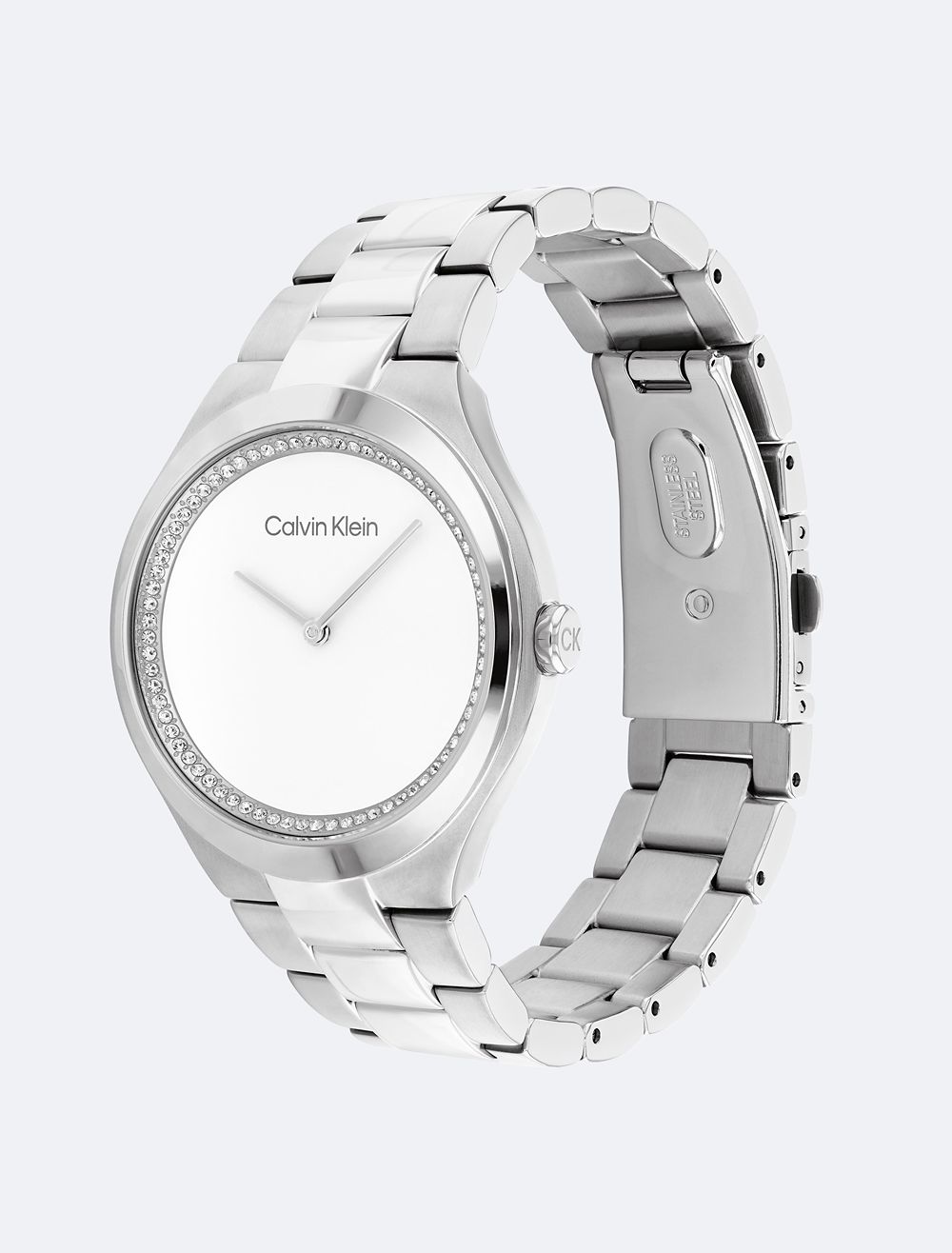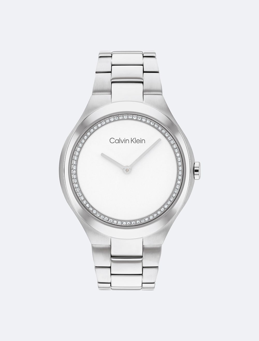 Featuring a minimal, contrast toned dial, this watch is embellished with crystals along the bezel. Made with a stainless steel case on a link bracelet. Styled with a 2 hand design and detailed with a clasp closure.- 36mm stainless steel case