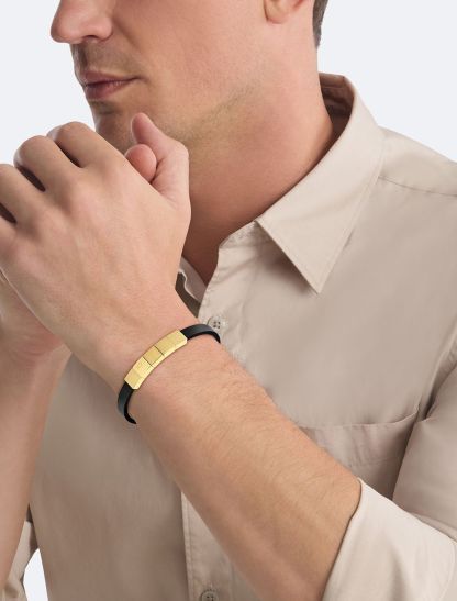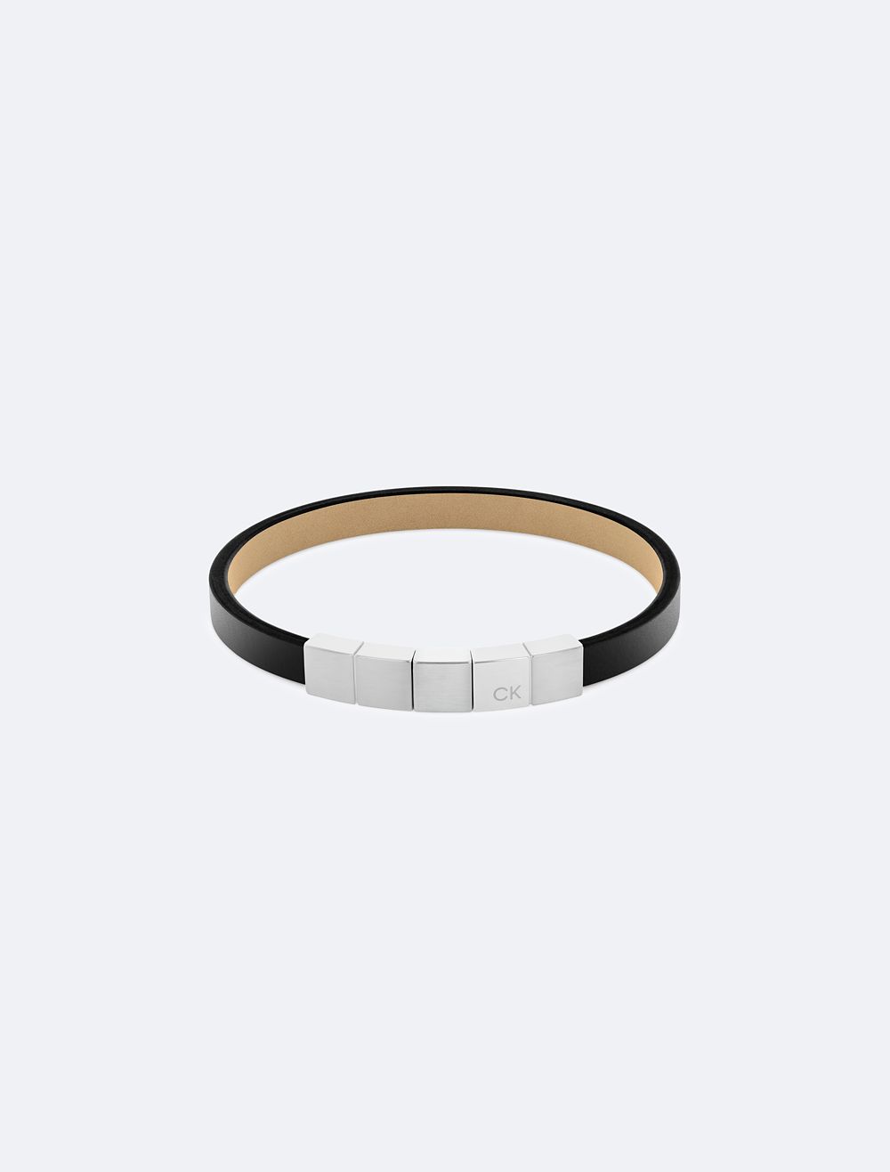 Minimal and modern, this bracelet features square beads. Juxtaposed with a leather strap and finished with an engraved CK monogram logo.- Offered with stainless steel or gold plated beads
