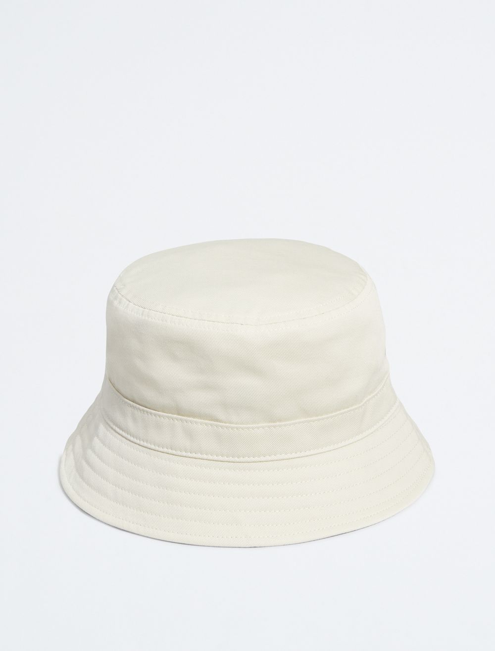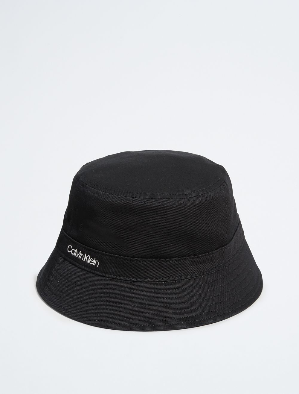 Crafted with cotton twill, this bucket hat features a Calvin Klein logo at center front. Made with a sloped brim and finished with topstitching accents.- Crafted with pure cotton