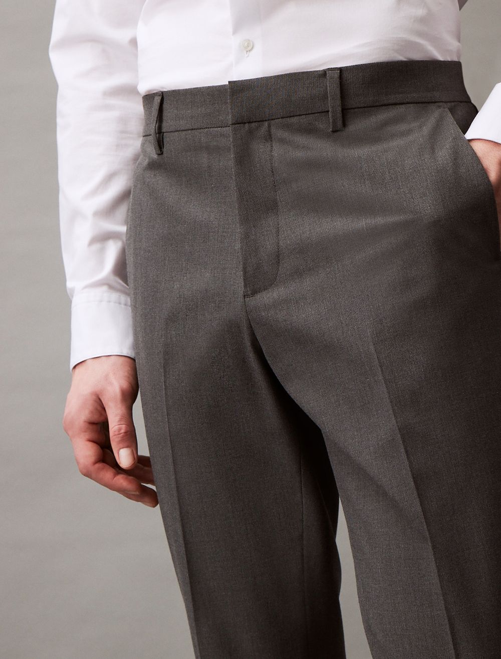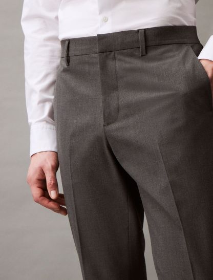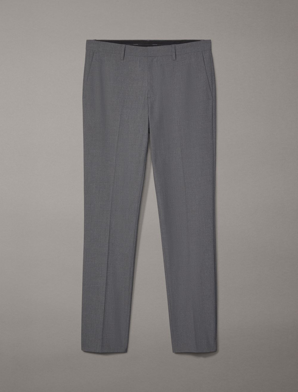 Elegant and composed, these Calvin Klein pants are made from textured end-on-end fabric blended with stretch for added flexibility. Tailored in a slim fit with multiple pockets and an interior hook closure. Pair these with the Refined End-On-End Stretch Slim Fit Blazer to complete the full suit.- Textured end-on-end fabric blended with stretch for flexibility