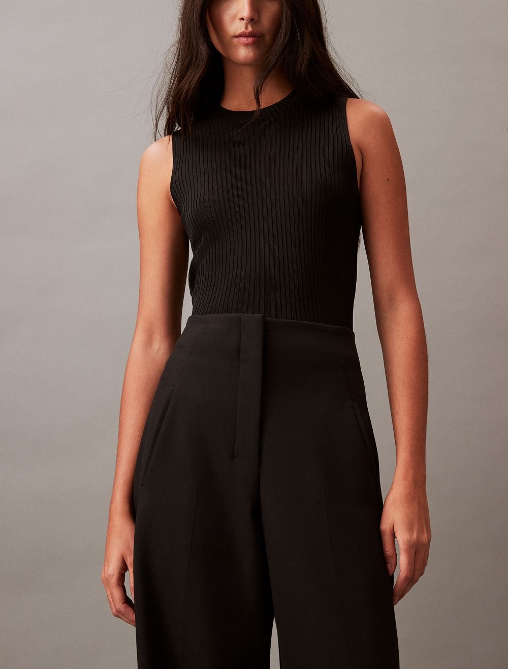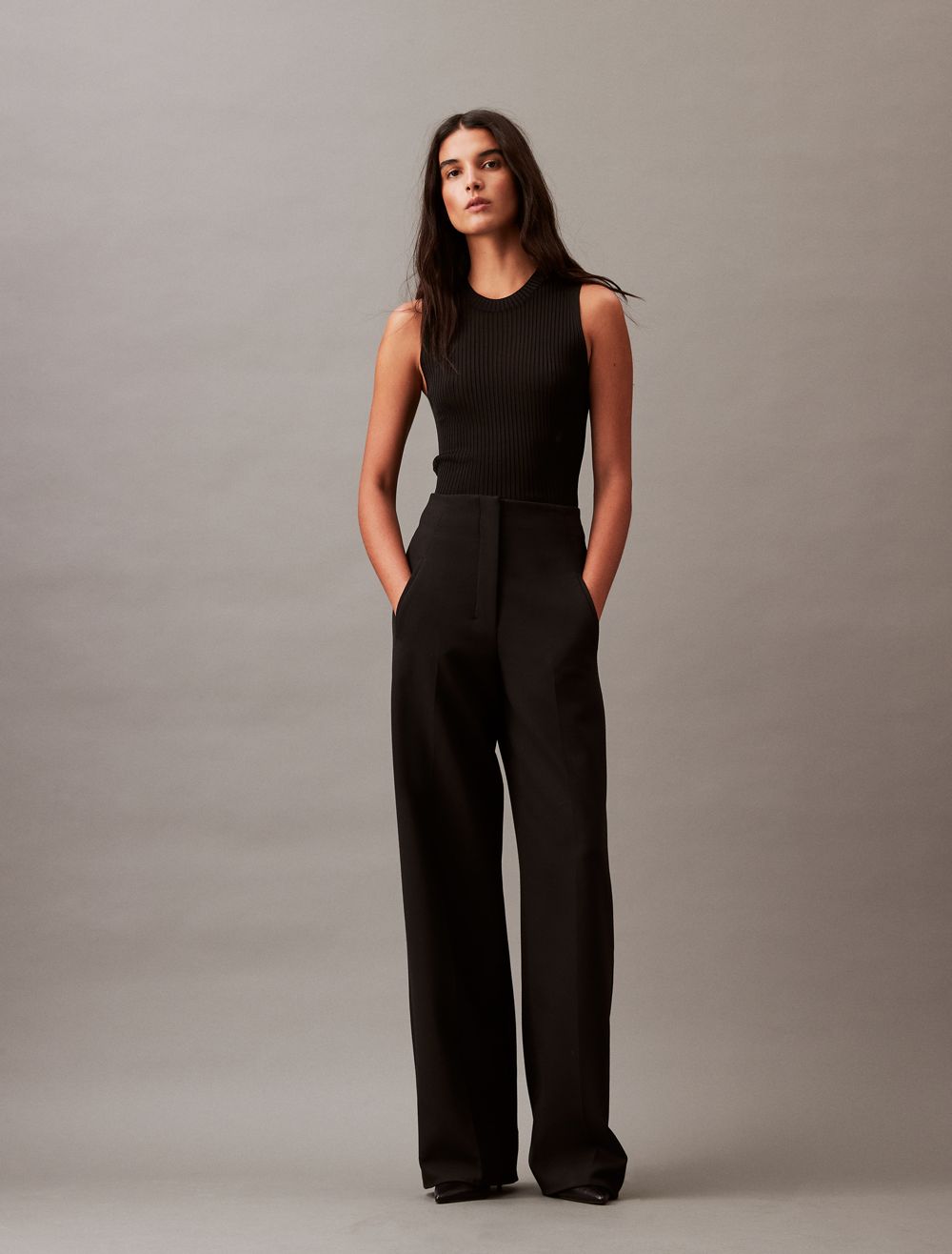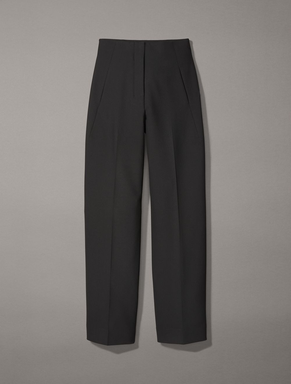 A structured silhouette, these pants have a streamlined wide leg fit tailored with neatly pressed creases. Detailed with a concealed zip fly and tab closure for a minimalist touch. Cut with a high rise waist shaped with angled darts along the sides.- Structured silhouette, blended with stretch for flexibility
