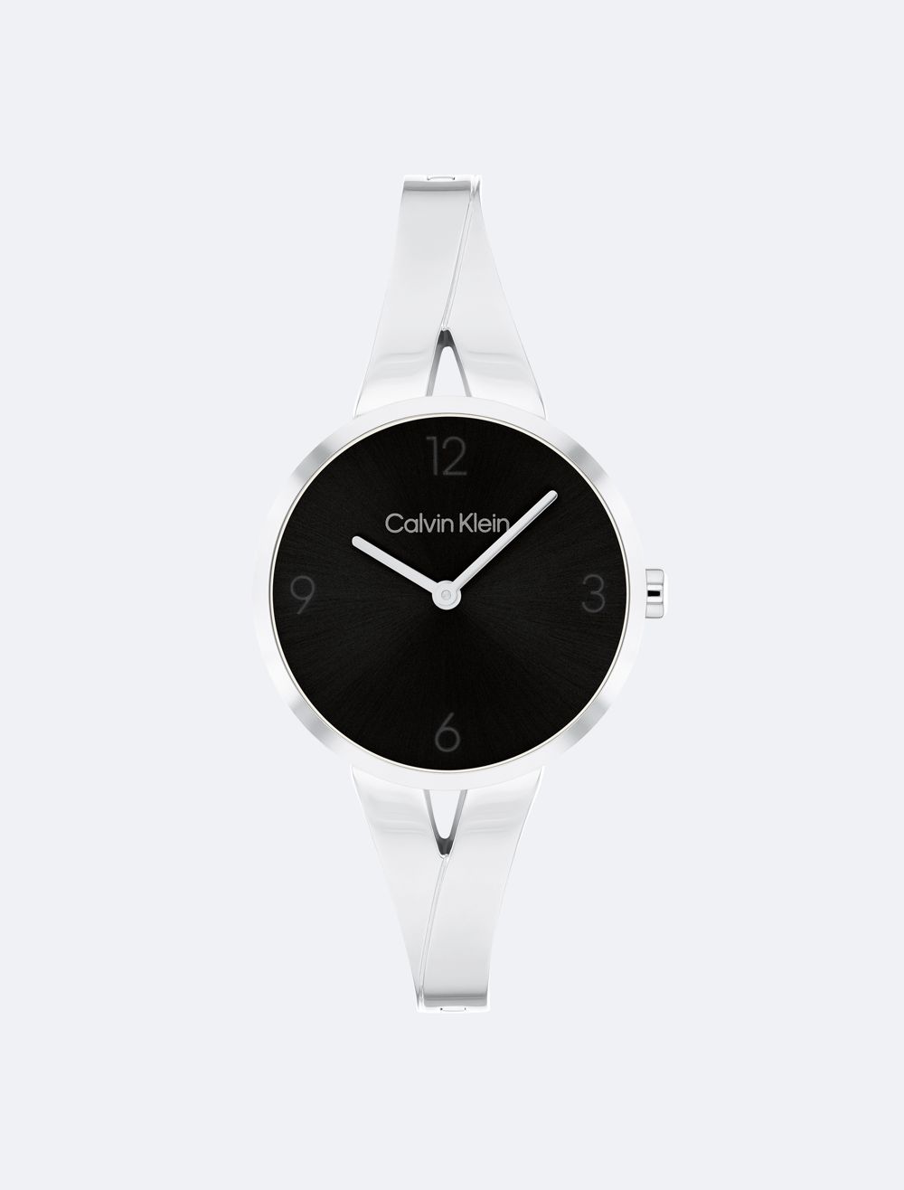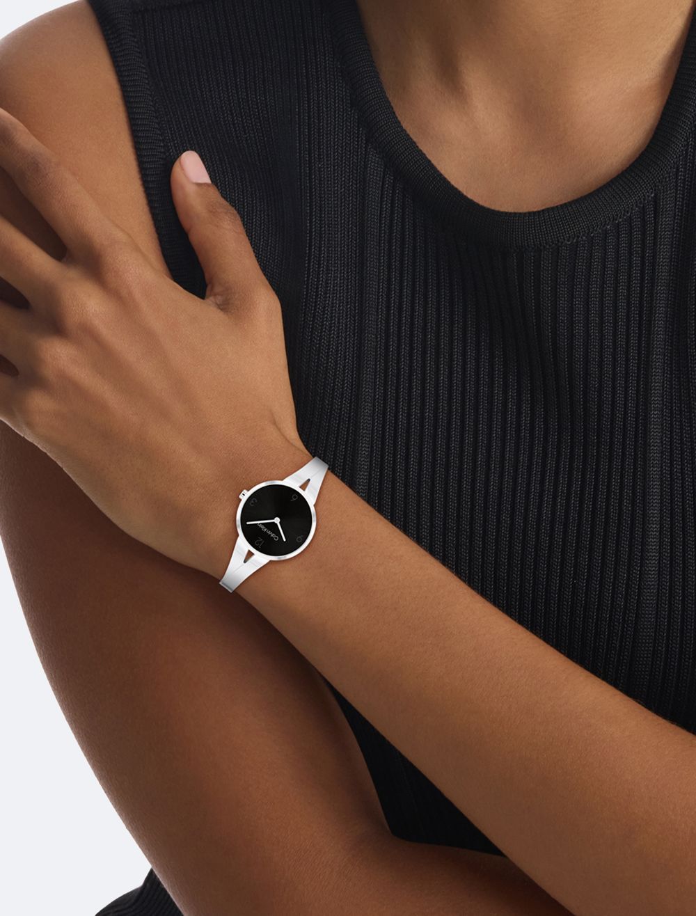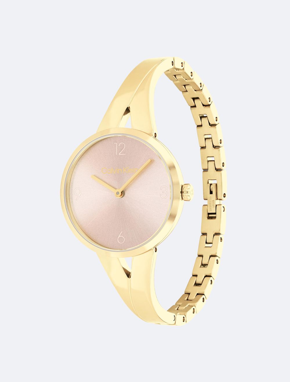 Sculpted jewelry-inspired bangle watch with a sensual taper around the wrist. Elegantly minimal with a clean sunray dial, featuring nested numerals at cardinal points. Adjustable with sizeable links.- 30mm stainless steel or gold-plated case