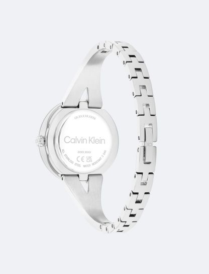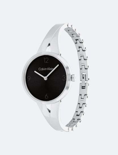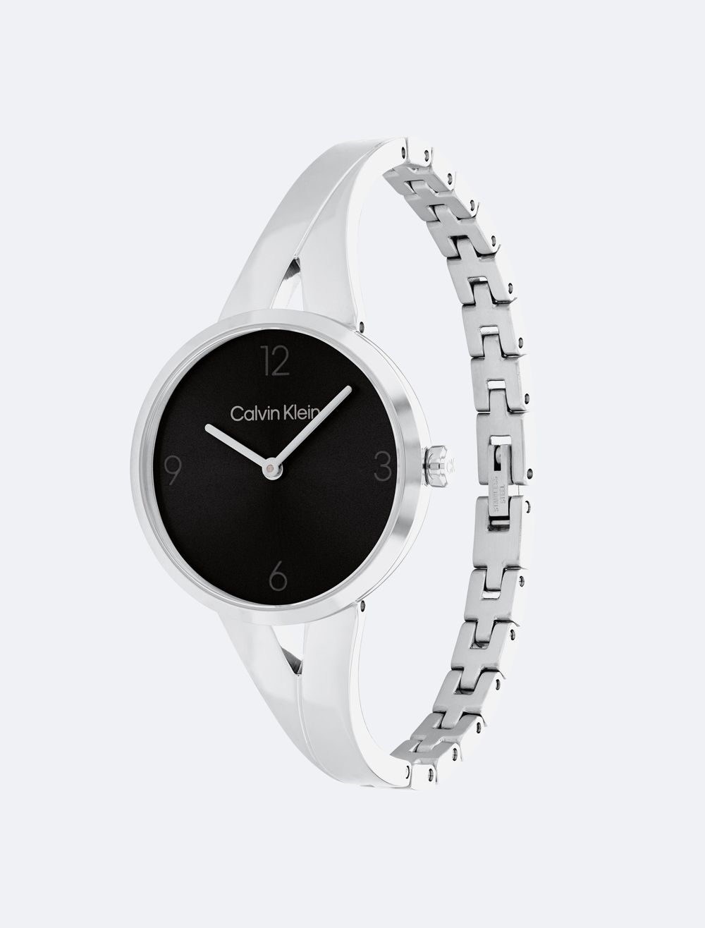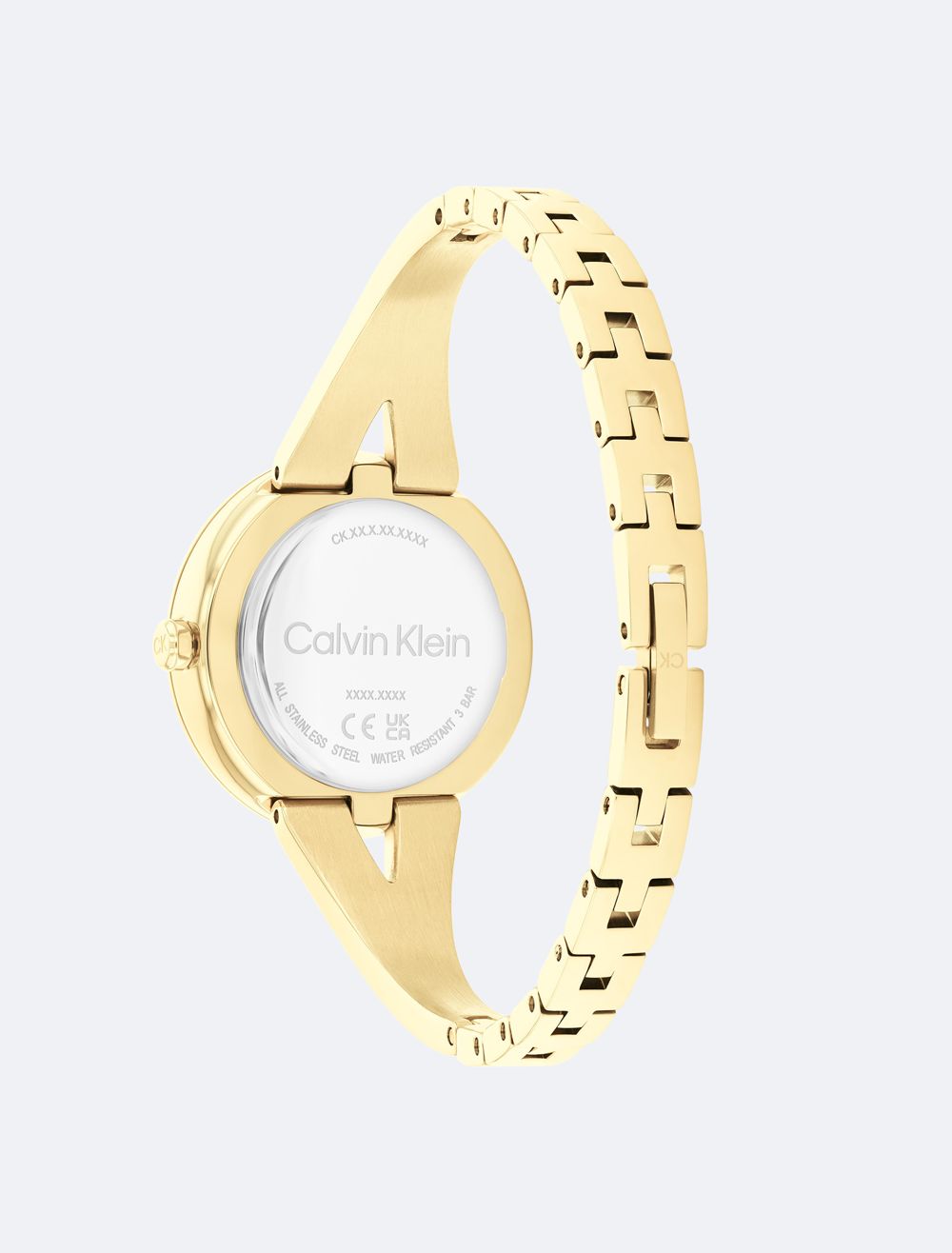 Sculpted jewelry-inspired bangle watch with a sensual taper around the wrist. Elegantly minimal with a clean sunray dial, featuring nested numerals at cardinal points. Adjustable with sizeable links.- 30mm stainless steel or gold-plated case
