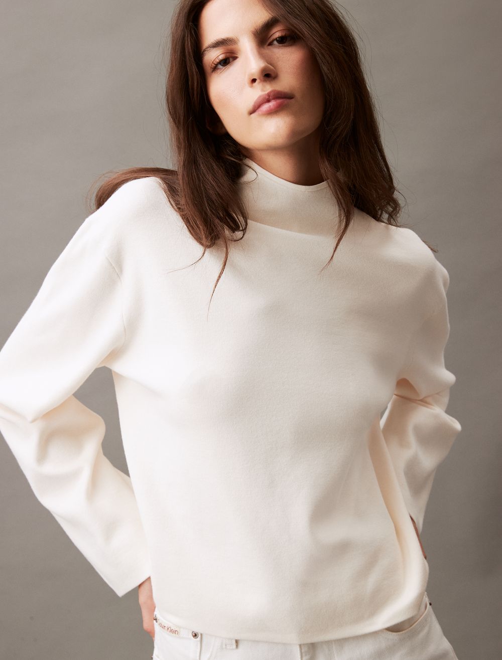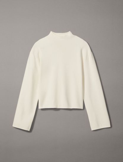Woven with a half milano knit, this sweater is styled with long sleeves and a mock neck. Designed with drop shoulders for a relaxed fit. Created with simple, solid styling for a modern look.- Half milano knit