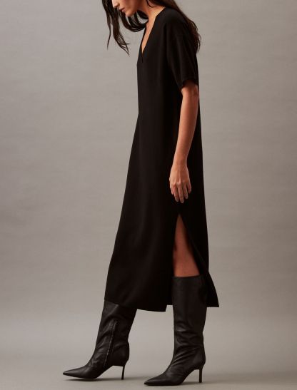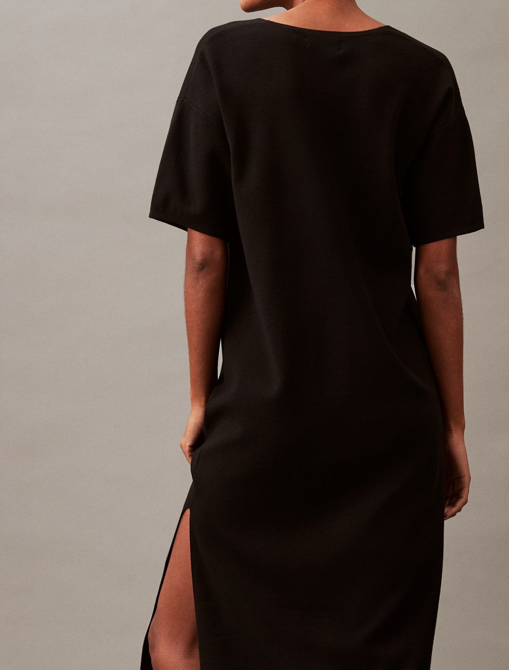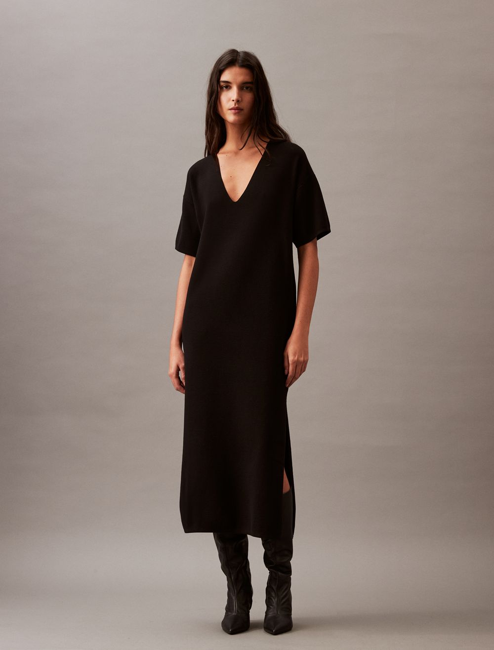 Woven with a half milano knit, this dress is styled with a low V-neckline and features a soft, subtle drape. Cut in a midi length and designed with a relaxed fit. Detailed with a split hem at one side.- Half milano knit