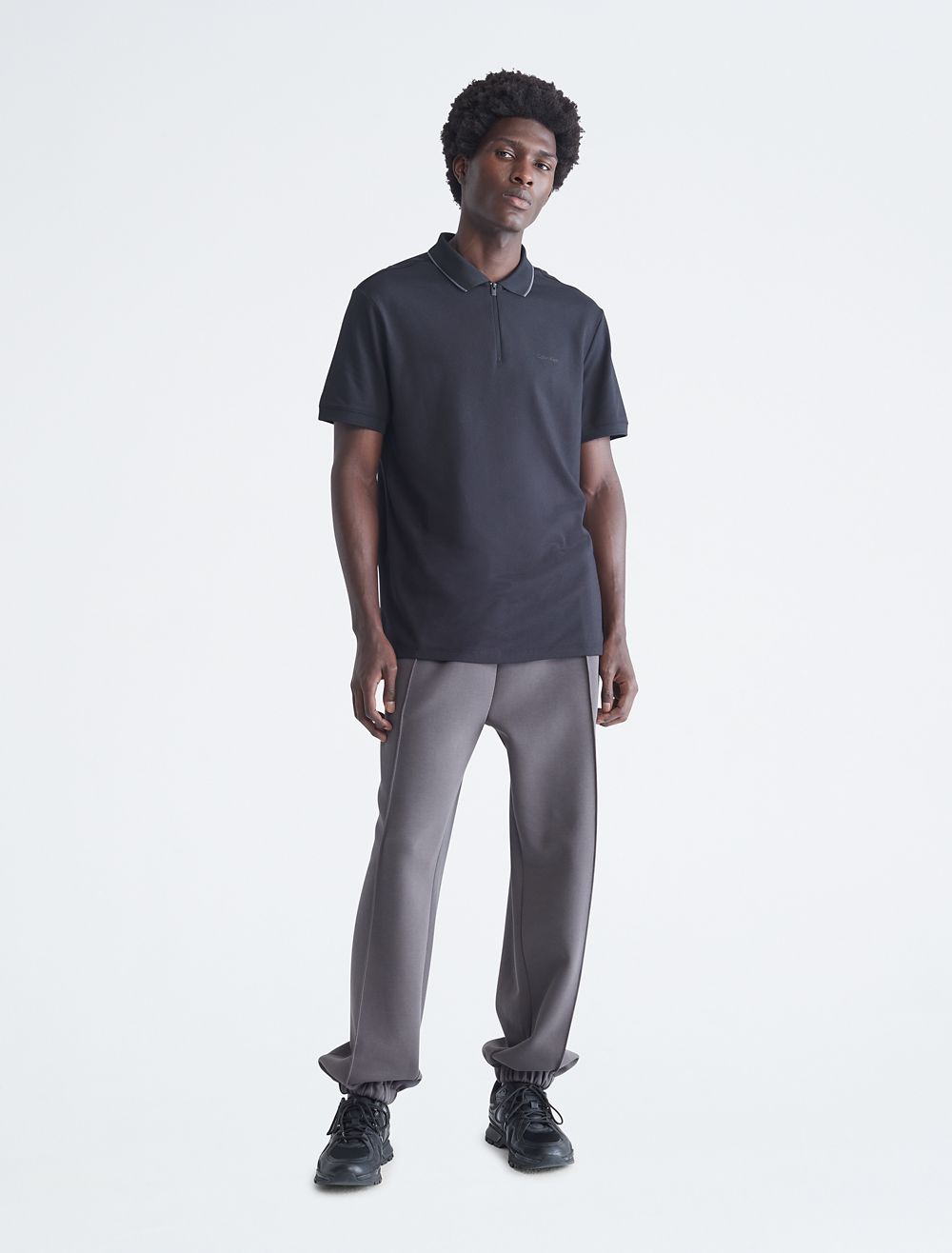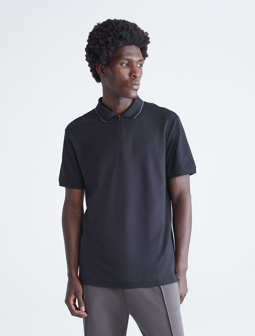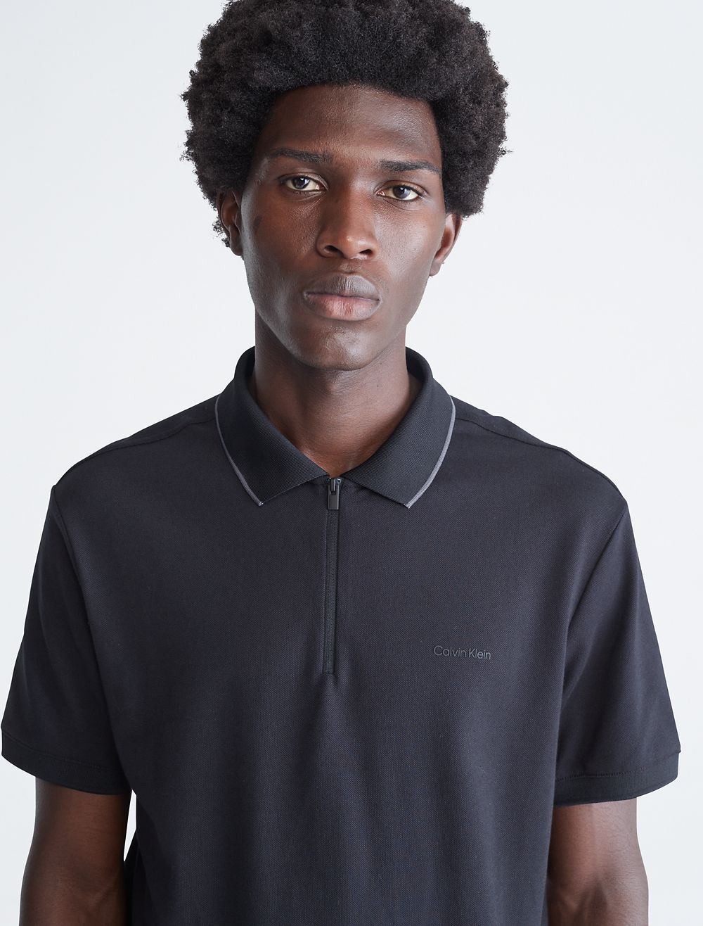 - Tipped polo collar + zip front