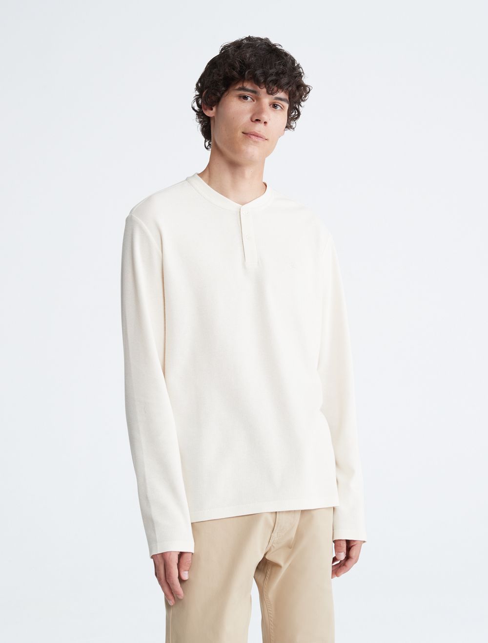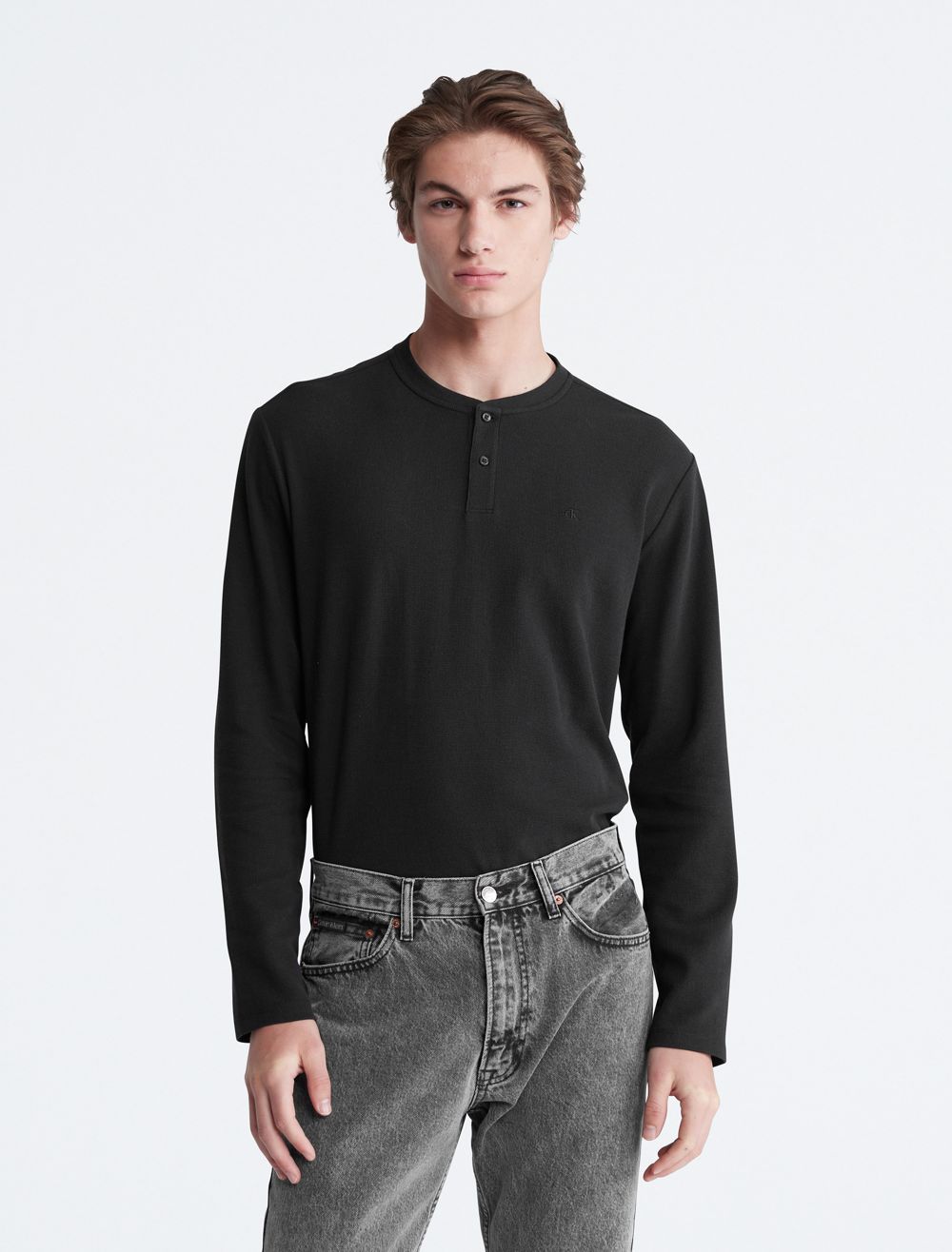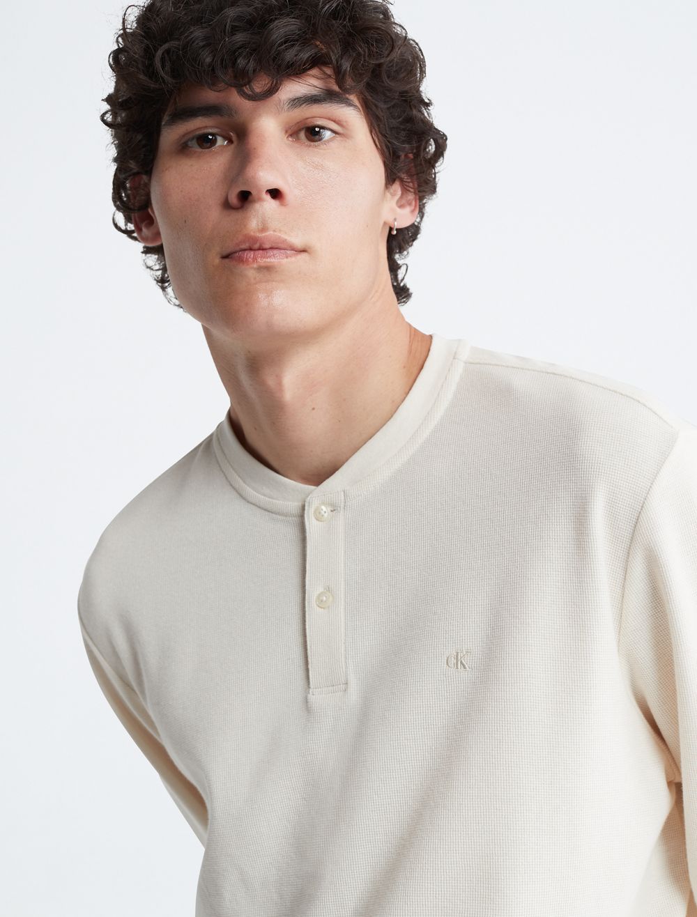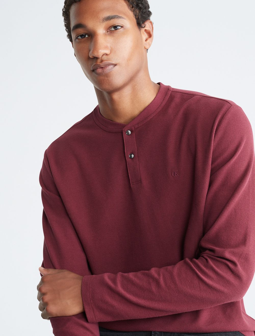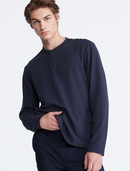 Styled with a waffle knit throughout, this henley t-shirt is perfect for a relaxed, laid-back look. Designed with long sleeves and a crewneck. Features button closures near the neckline and finished with CK monogram logo embroidery at the upper chest.- Waffle knit throughout