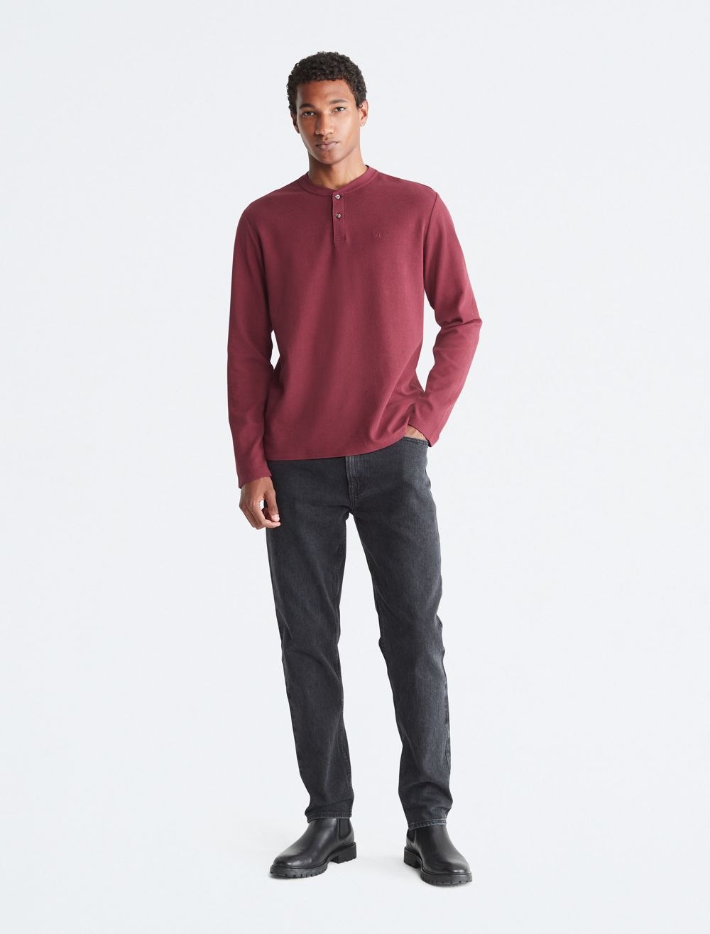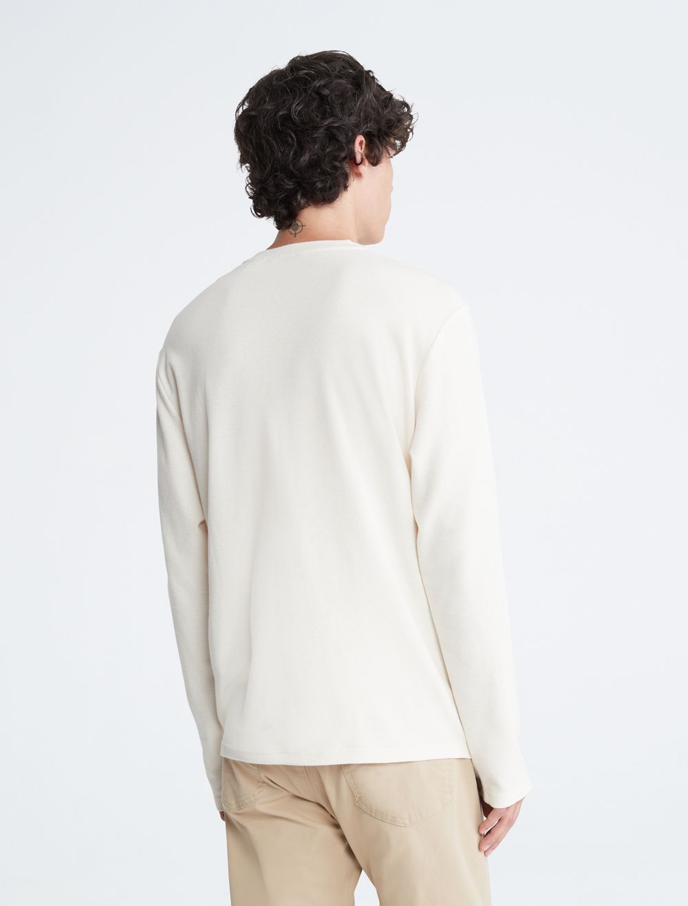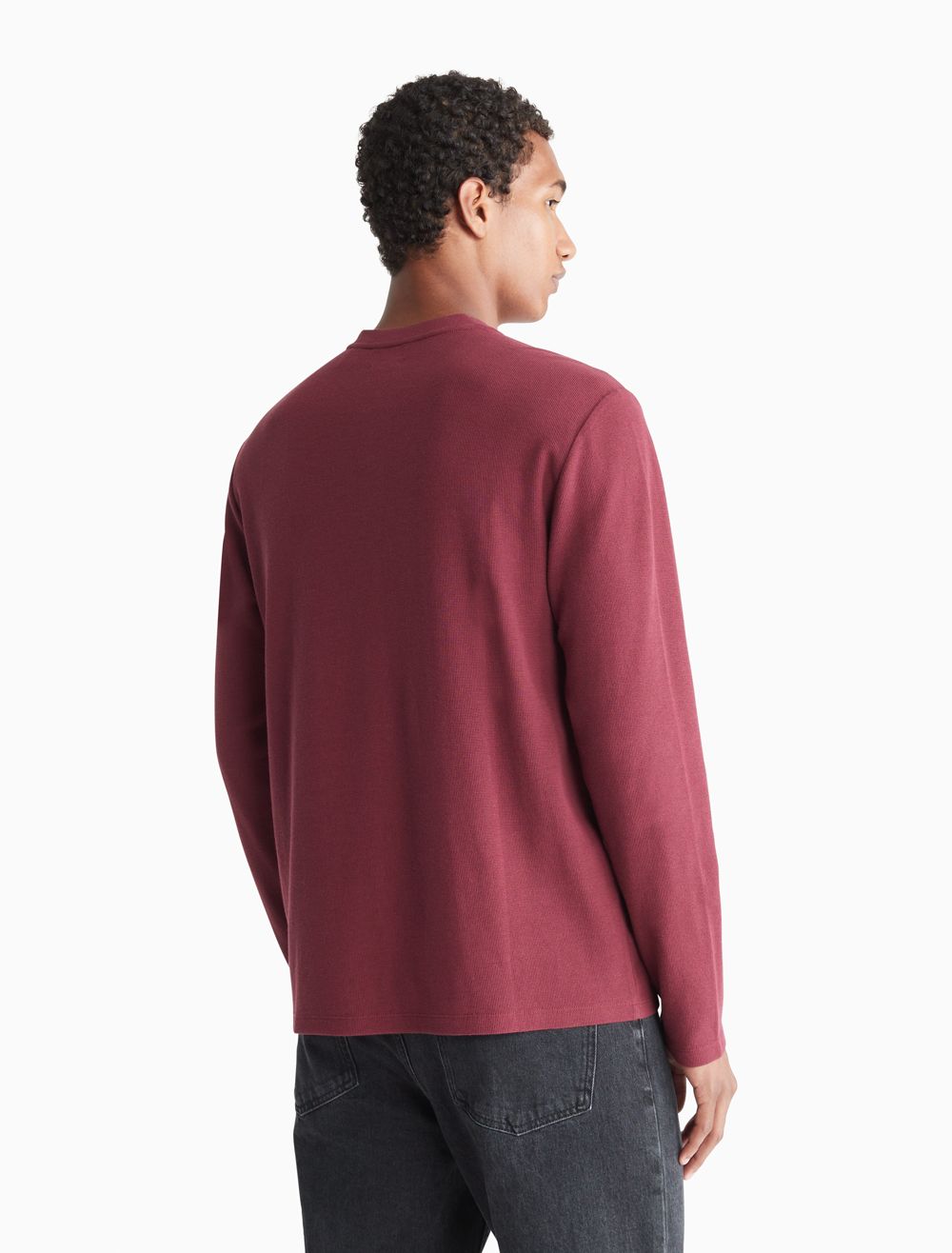 Styled with a waffle knit throughout, this henley t-shirt is perfect for a relaxed, laid-back look. Designed with long sleeves and a crewneck. Features button closures near the neckline and finished with CK monogram logo embroidery at the upper chest.- Waffle knit throughout