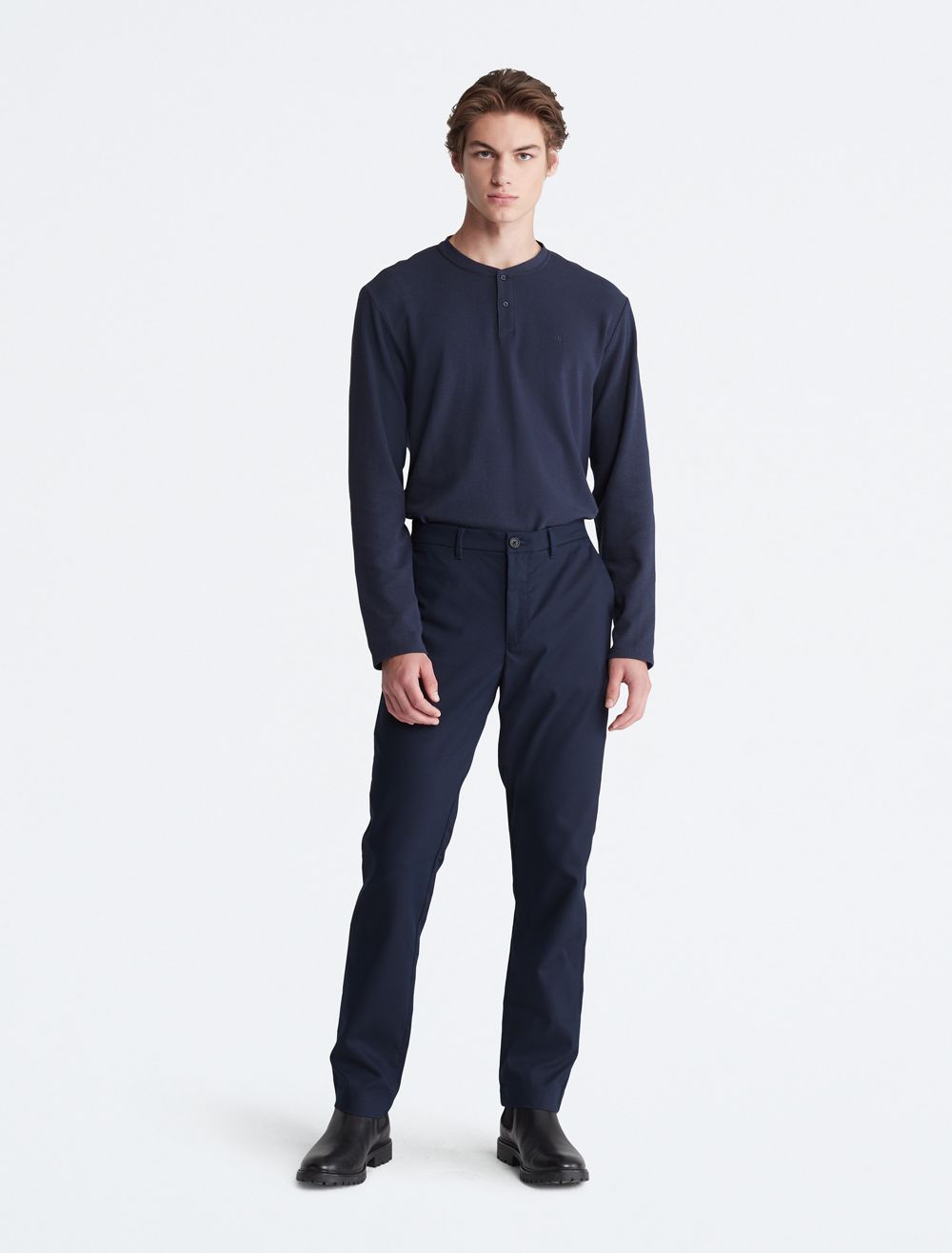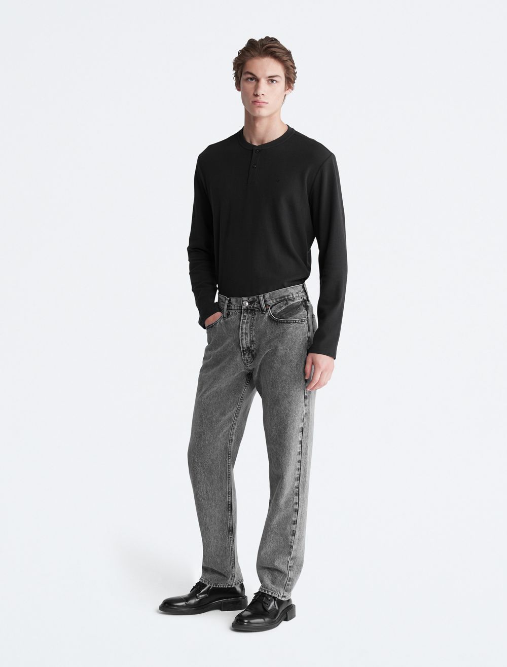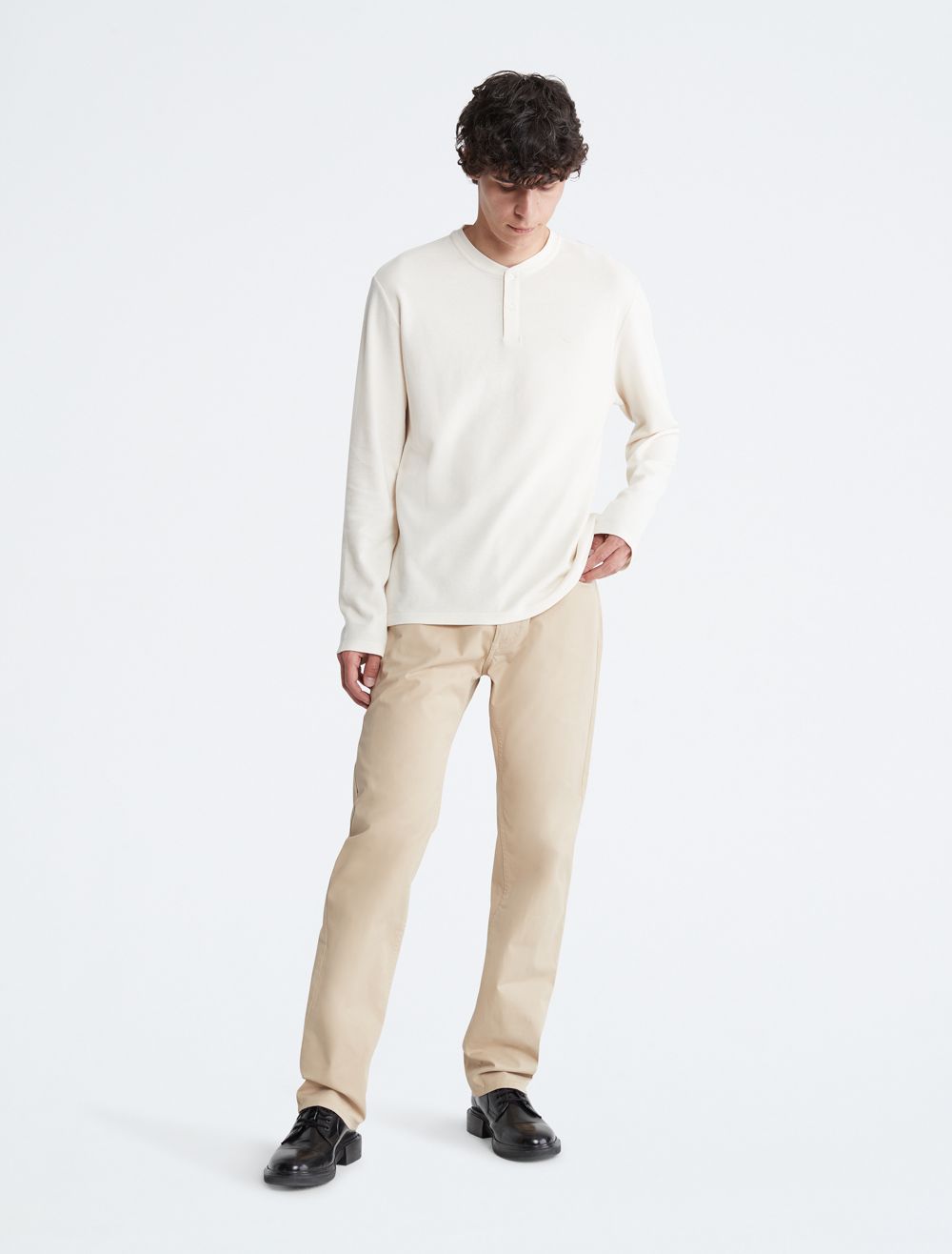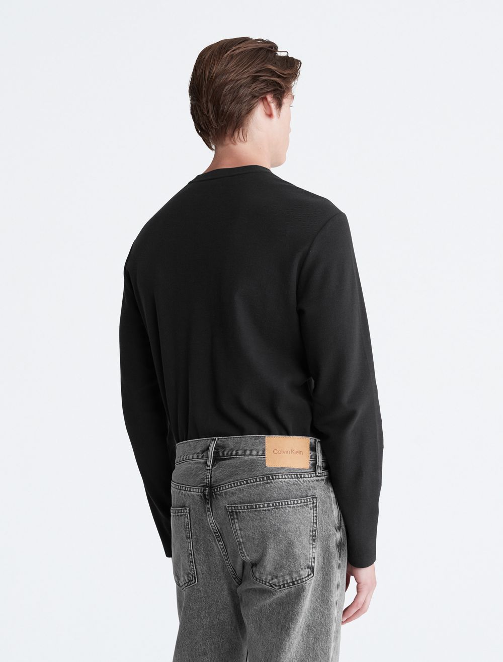 Styled with a waffle knit throughout, this henley t-shirt is perfect for a relaxed, laid-back look. Designed with long sleeves and a crewneck. Features button closures near the neckline and finished with CK monogram logo embroidery at the upper chest.- Waffle knit throughout