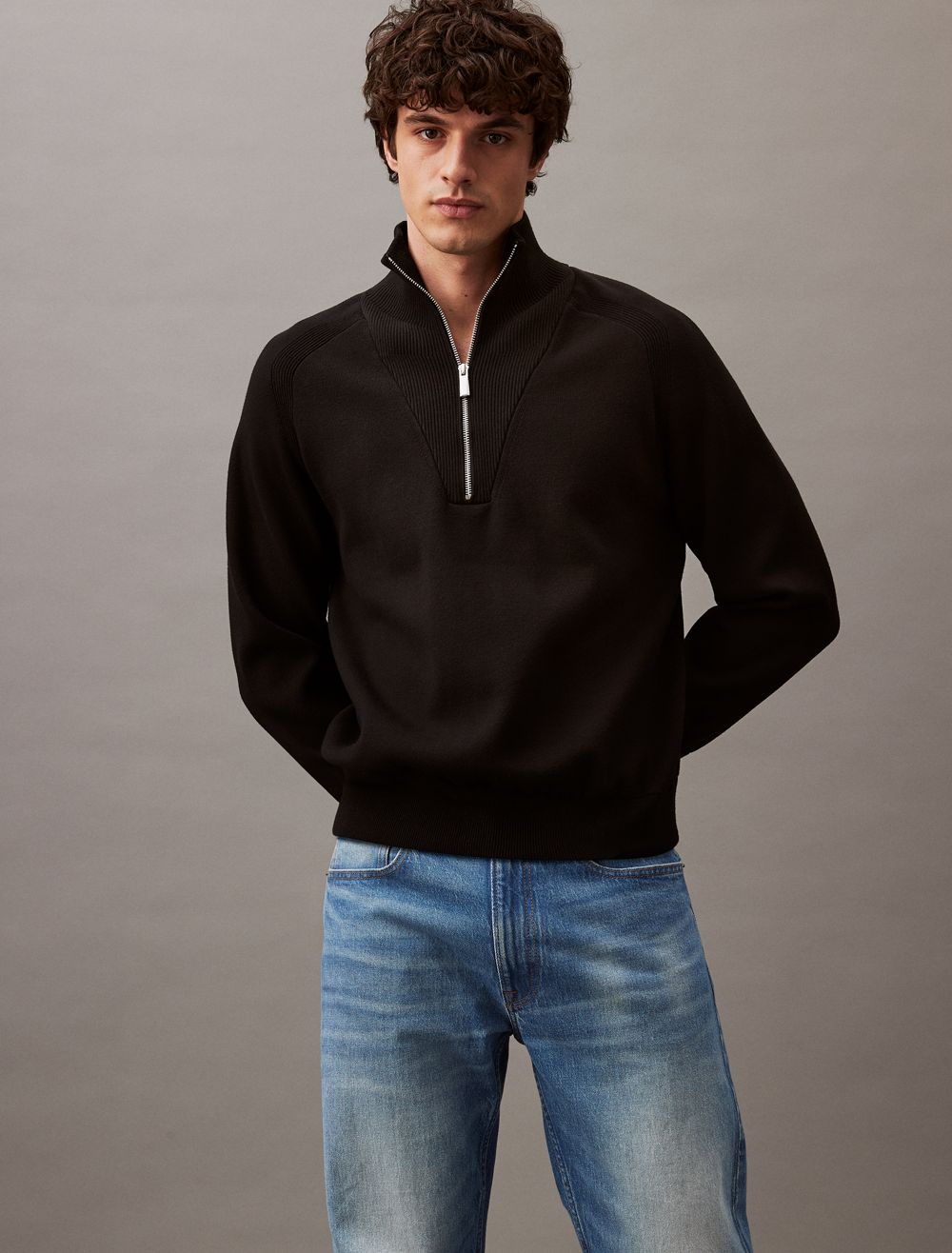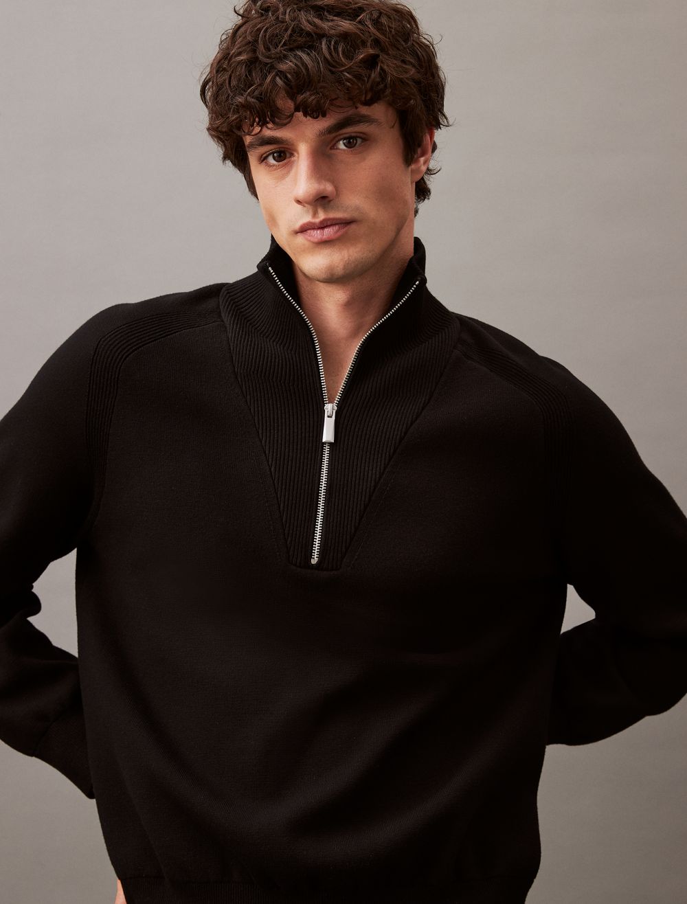 - Quarter zip closure and rib-knit fabric