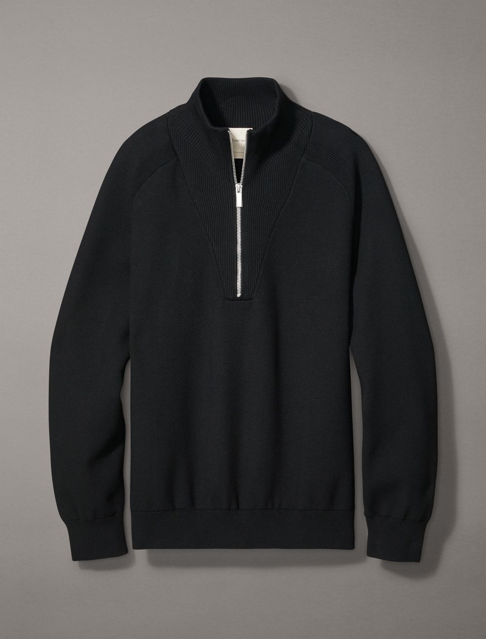 Woven with a half milano knit, this Calvin Klein pullover sweater features a standout rib-knit neck and a smooth body. Perfect as a layering piece, this top is finished with a stand collar, a 1/4 zip closure, long raglan sleeves and saddle shoulder construction.- Solid design for versatile, easy-to-wear styling
