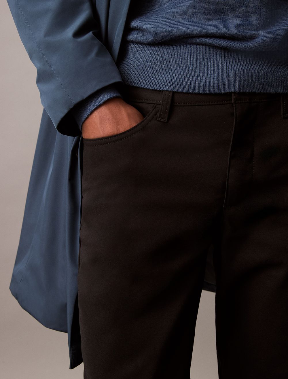 Crafted with stretch, these woven pants are made for an easy, flexible fit. Made with wrinkle resistant fabric, perfect for those on-the-go. Features classic 5-pocket styling and finished with a Calvin Klein logo patch at the back waist.- Provides ultimate comfort by stretching as you move