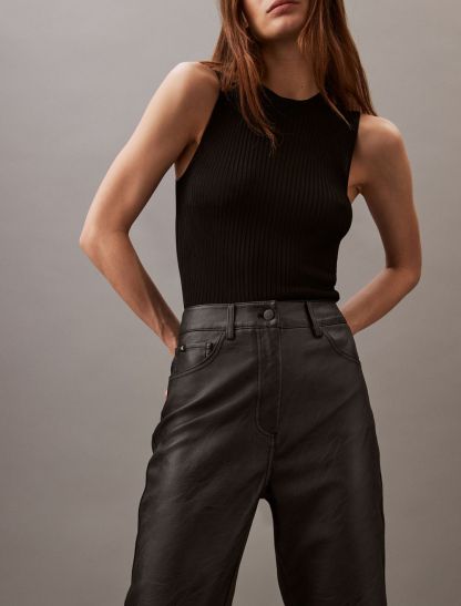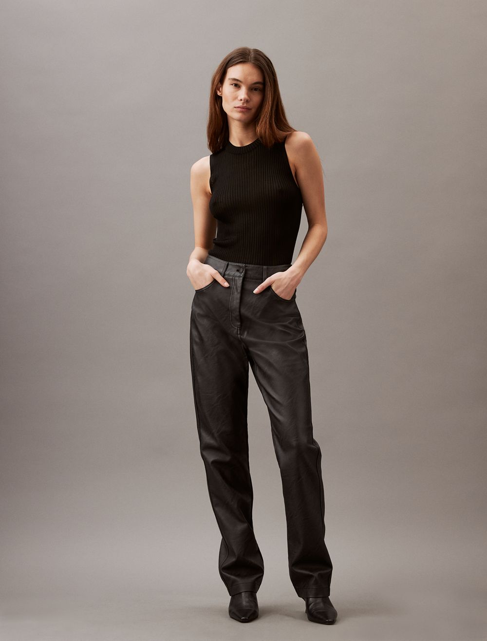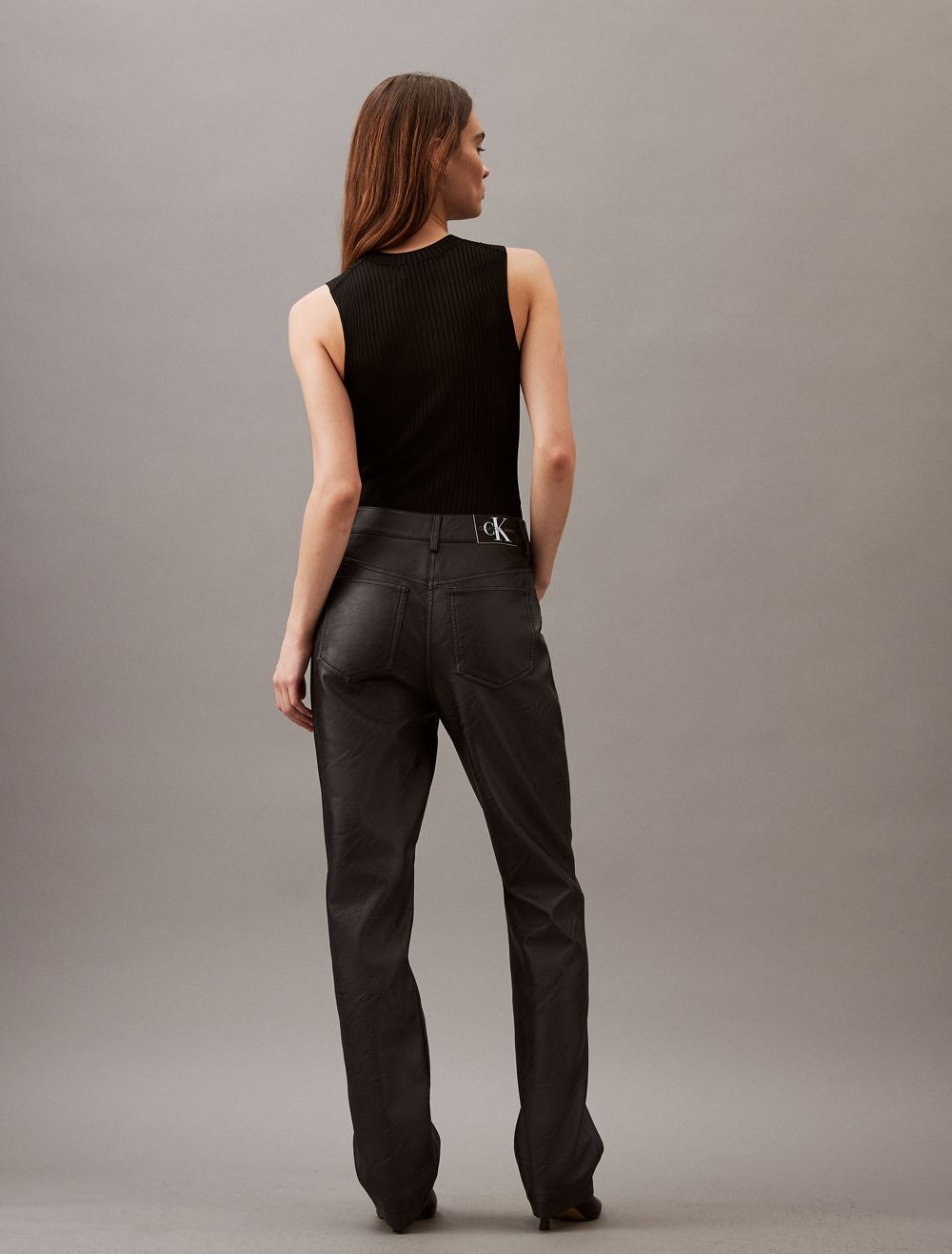 Crafted from faux leather, these pants are cut in a sleek straight leg silhouette. Fitted with a high rise waist and designed with slip pockets at both sides. Made with a zip fly and a top button closure.- High rise waist