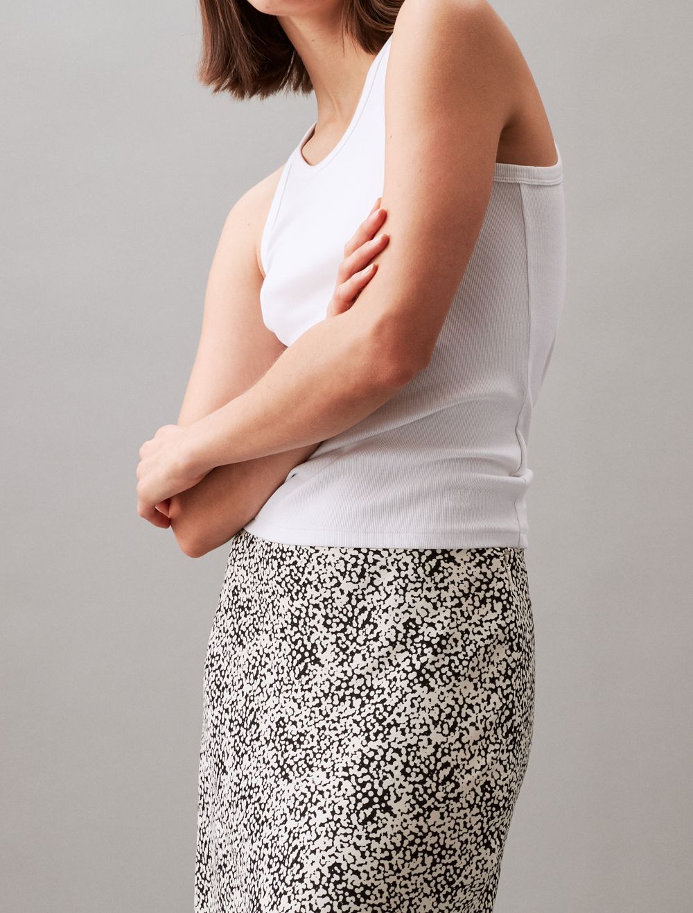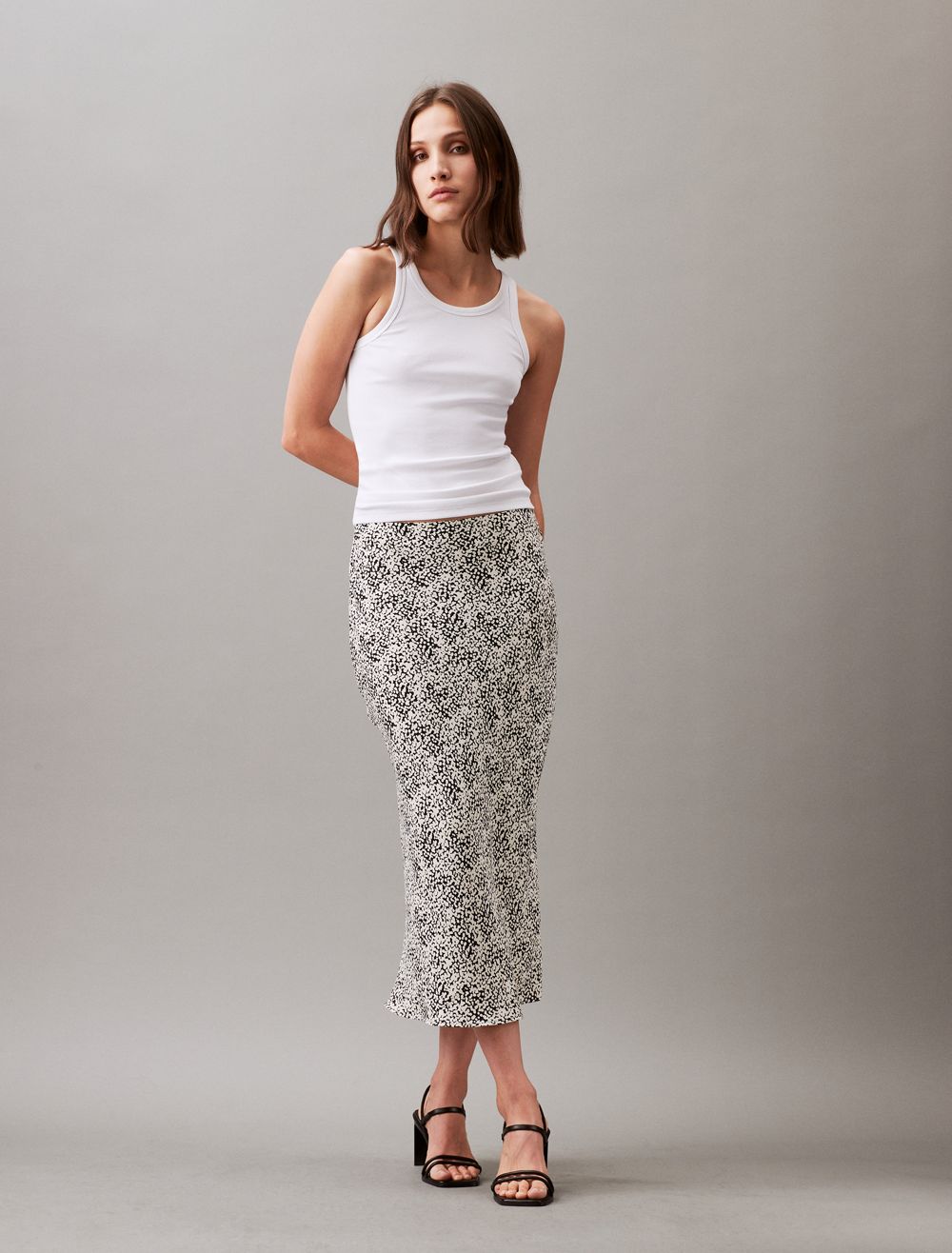 Designed with a gentle drape, this midi skirt is an chic piece that appears effortless when styled with a simple tank top. Cut in a slim fit and made with a high rise waist. Created with an allover dot print.- Allover dot print