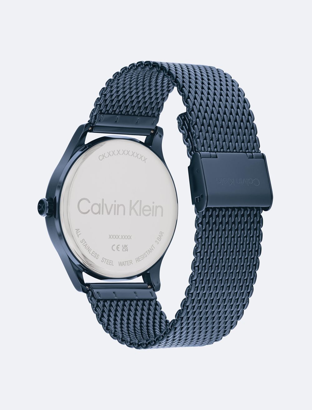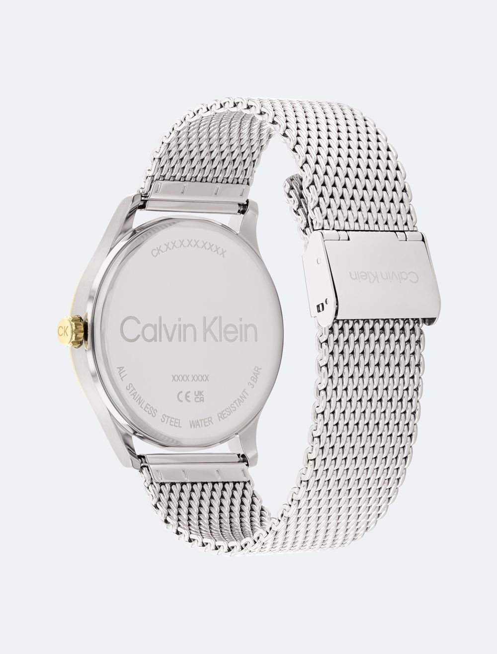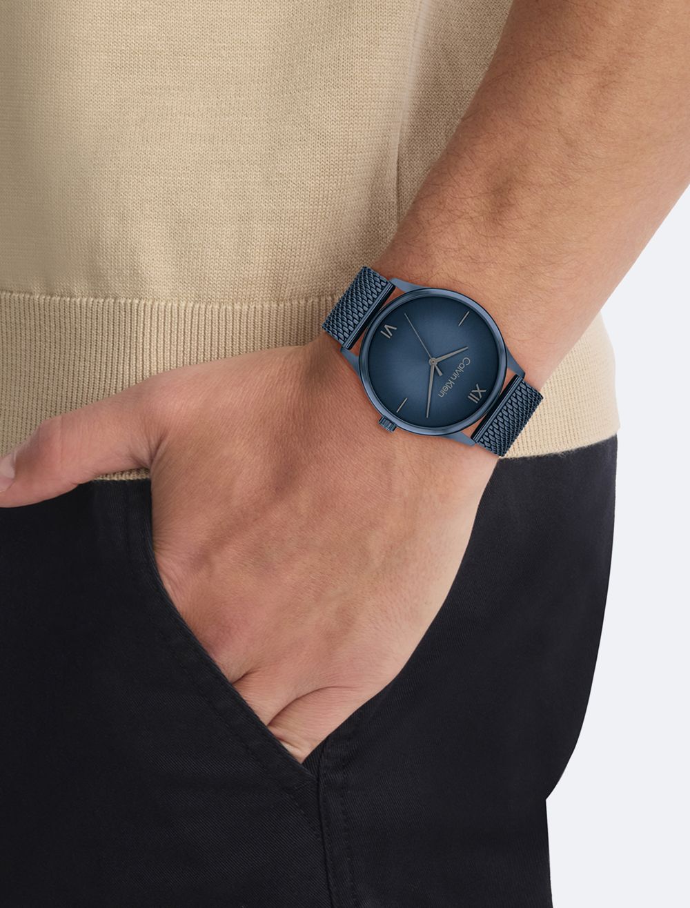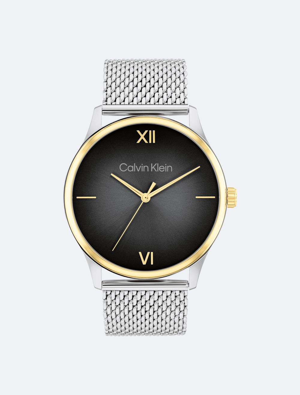Clean crisp lines for effortless sophisticated style. Bold Roman numerals at 12 and 6 o'clock with stick indices at the other cardinal points enhance this intriguing gradient sunray dial. Available on a mesh strap.- 43mm black IP or two-tone case