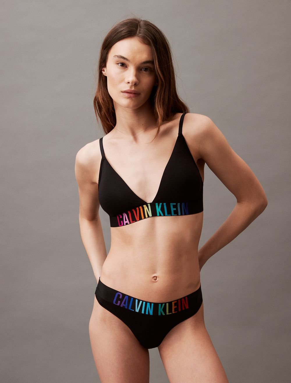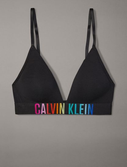Wear it with Pride. A bold iteration of our iconic logo with maximum comfort and enhanced movement. This CK lightly lined triangle bralette is made from a super soft cotton modal stretch blend with a wide supportive waistband for an unmistakable, modern look.- Pride styling in a limited edition rainbow color palette