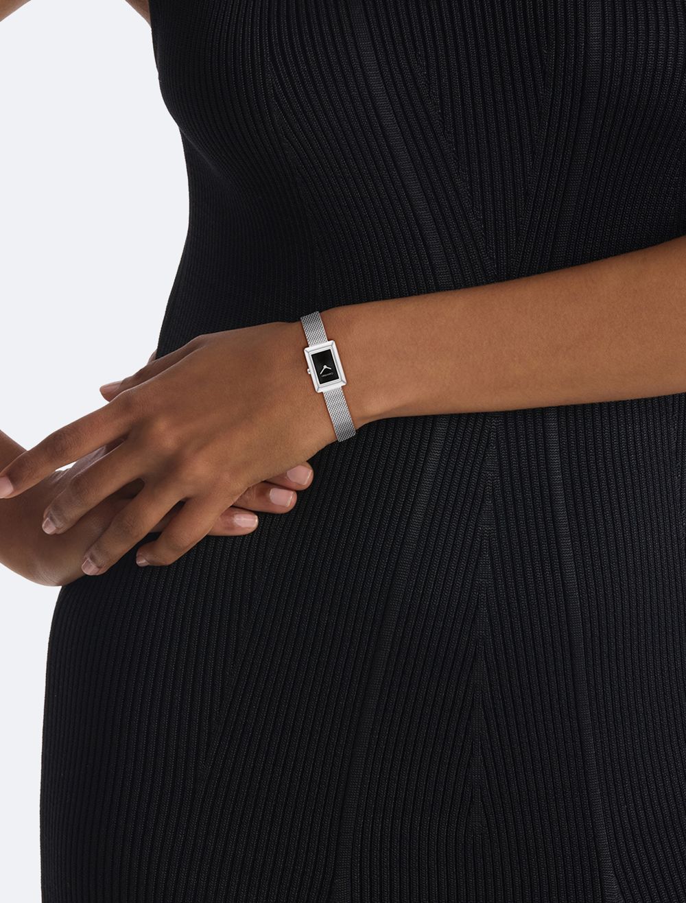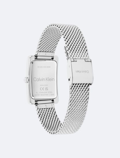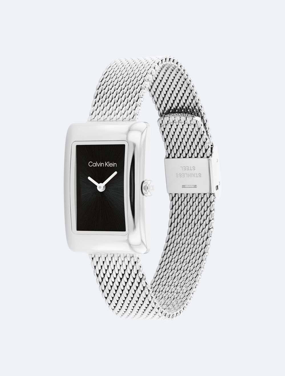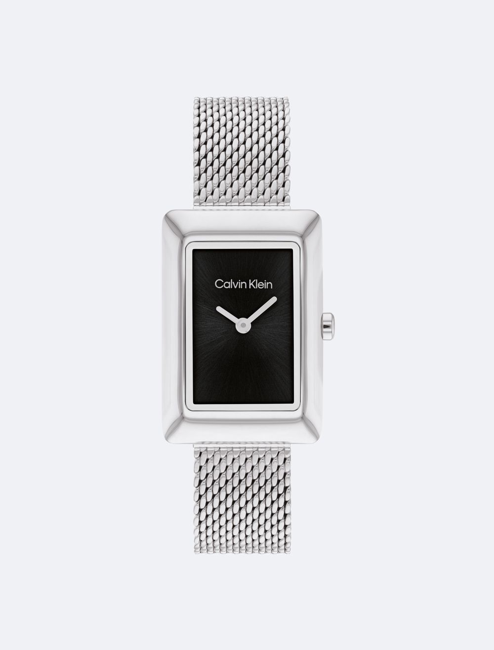 Understated and feminine. Softly sculpted rectangular case watch with a minimalistic sunray finish dial. Available on a mesh bracelet.- Offered in stainless steel, gold plating, or rose gold plating