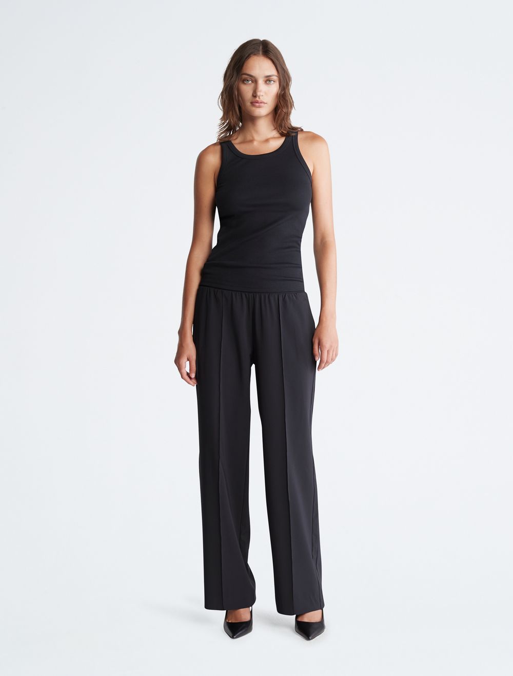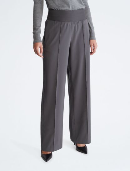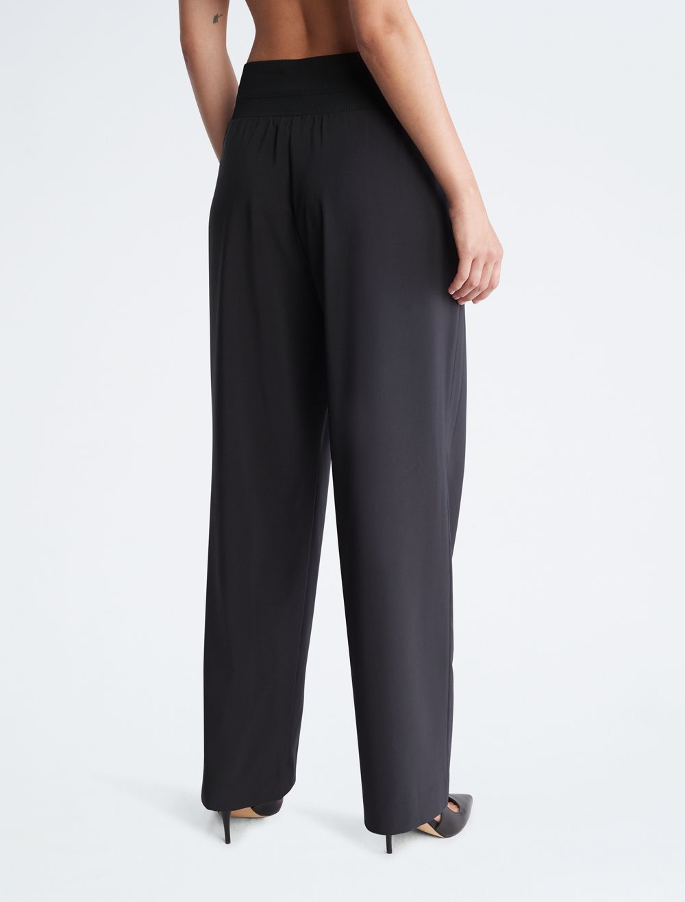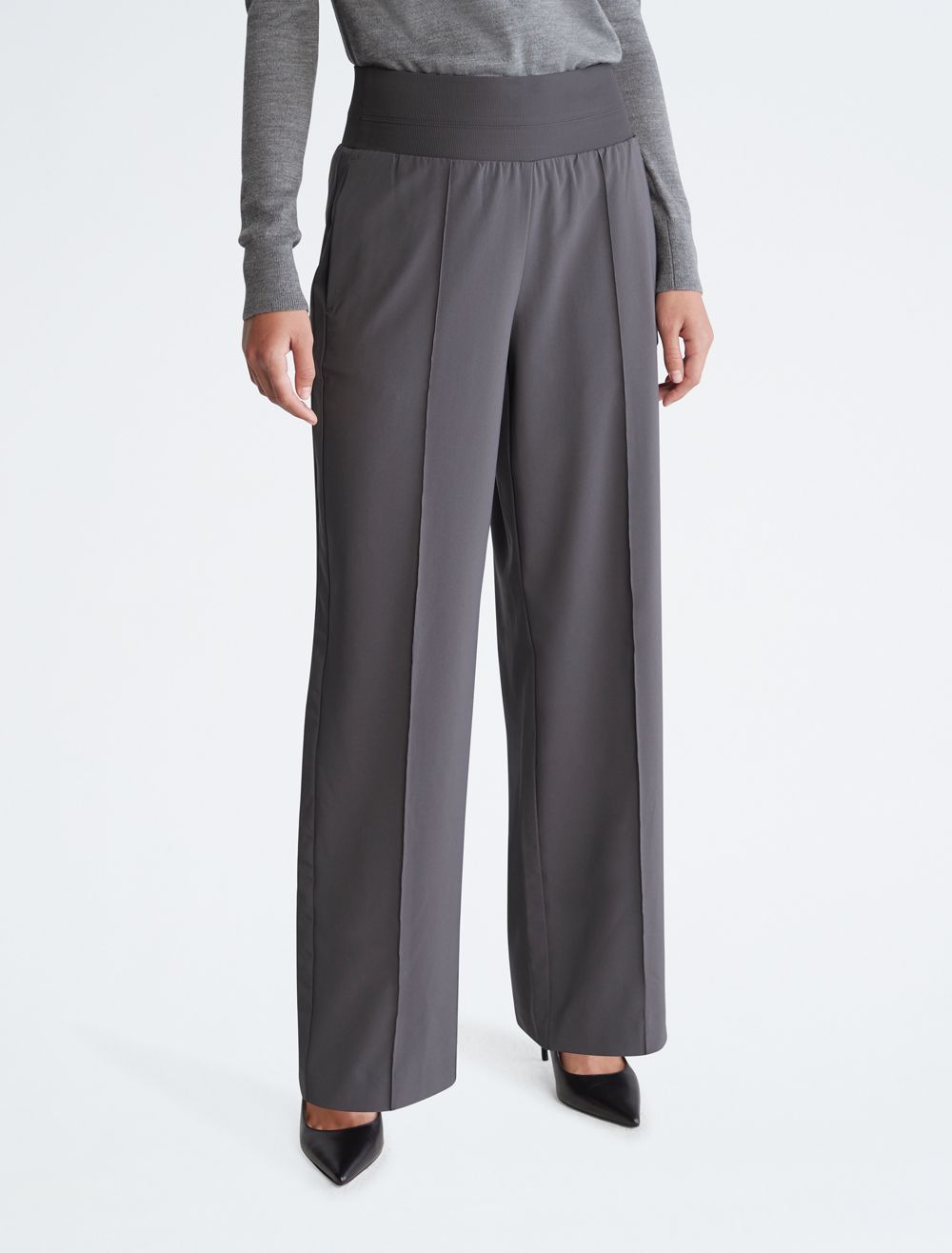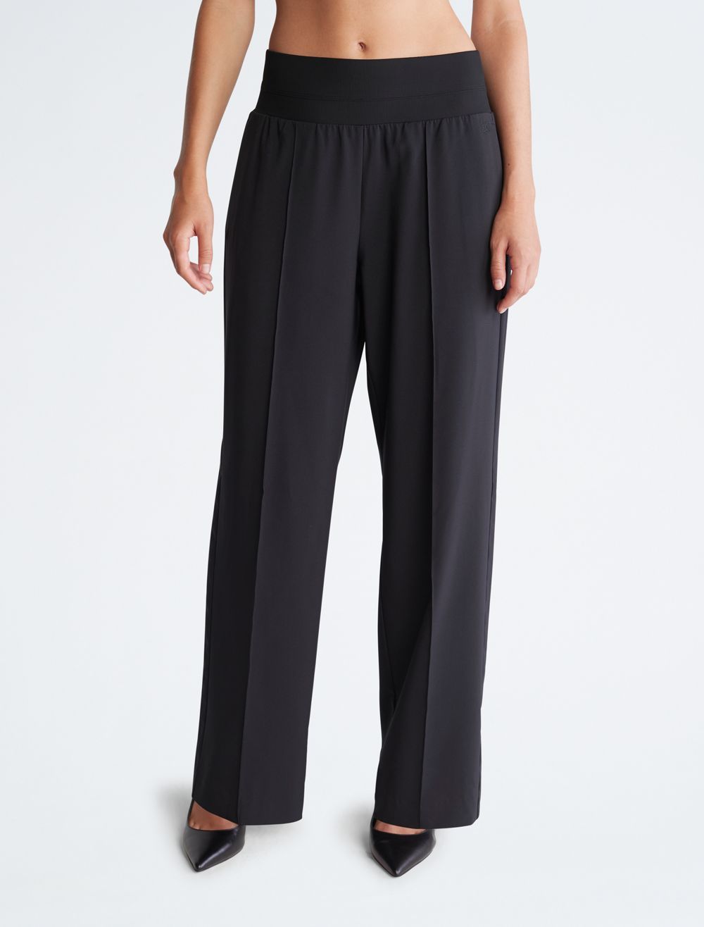 Tailored with a wide leg silhouette, these pants feature an elastic waistband for flexible comfort. Made with slip pockets at both sides. Finished with CK monogram logo embroidery near the hip.- High rise waist