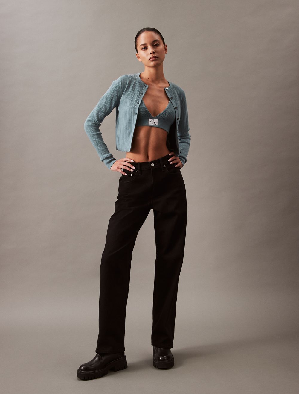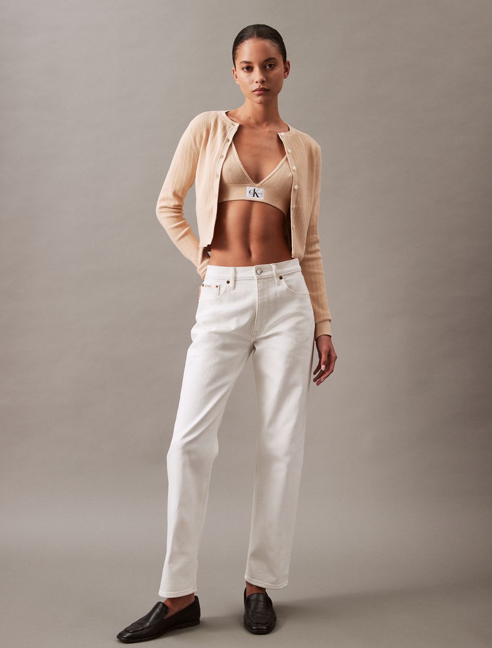 - CK monogram woven logo tag near the hem