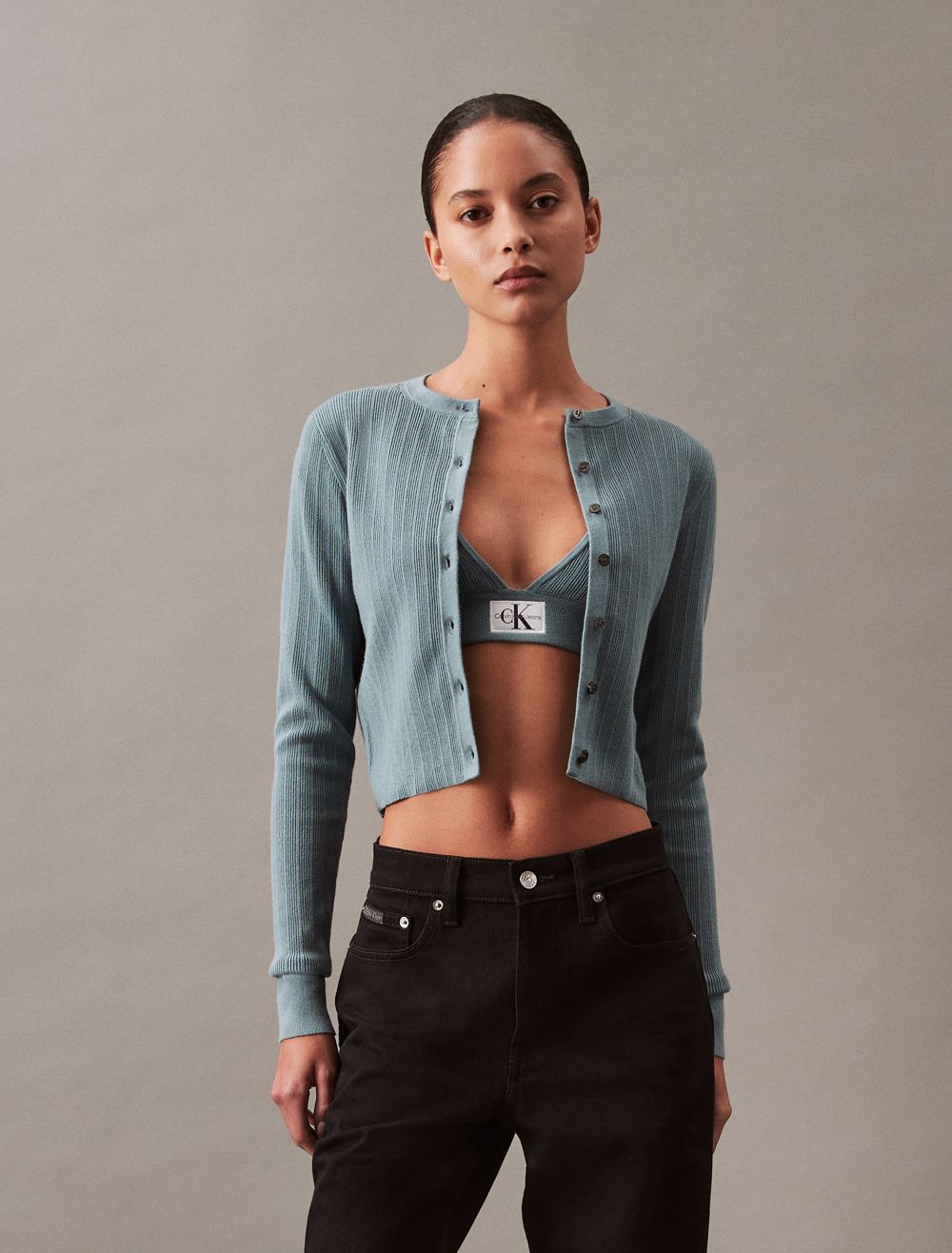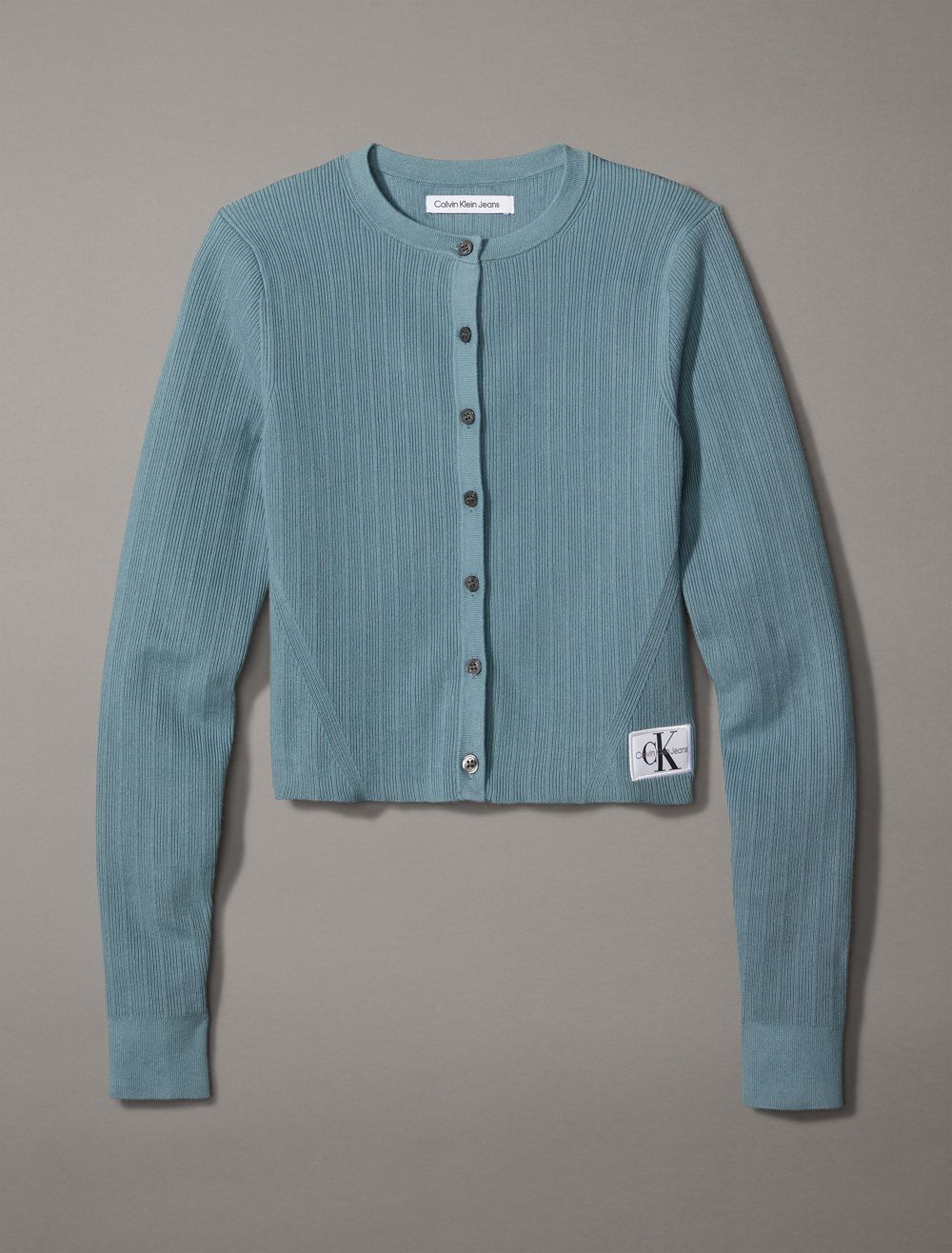 Crafted from a soft cotton-stretch blend, this cardigan features a variegated rib knit and a cropped length. Made with a slim, fitted silhouette and detailed with button closures along the front. Finished with a CK woven logo tag near the hem.- Variegated ribbed texture