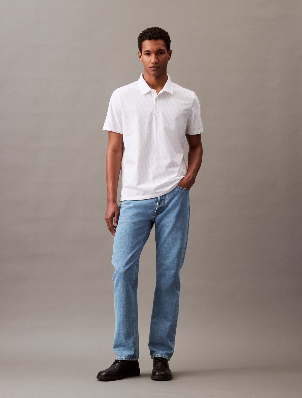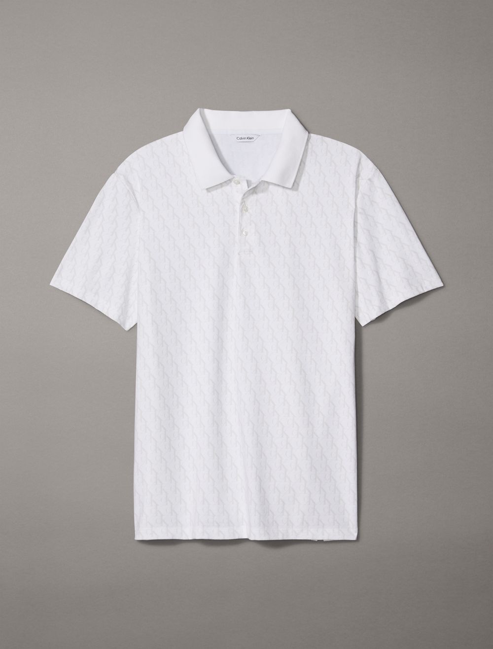 Sporty and modern, this signature Calvin Klein polo shirt is crafted from a compact cotton blend for a smooth hand with an extra sleek feel. Created with an allover CK monogram logo print. Detailed with a polo shirt collar, button closures and a vented hem for an effortless fit.- Allover monogram logo print