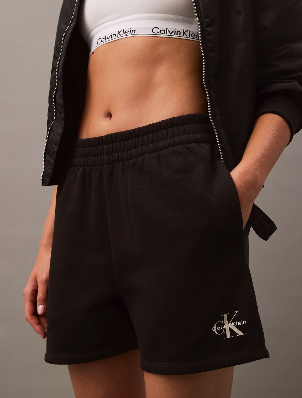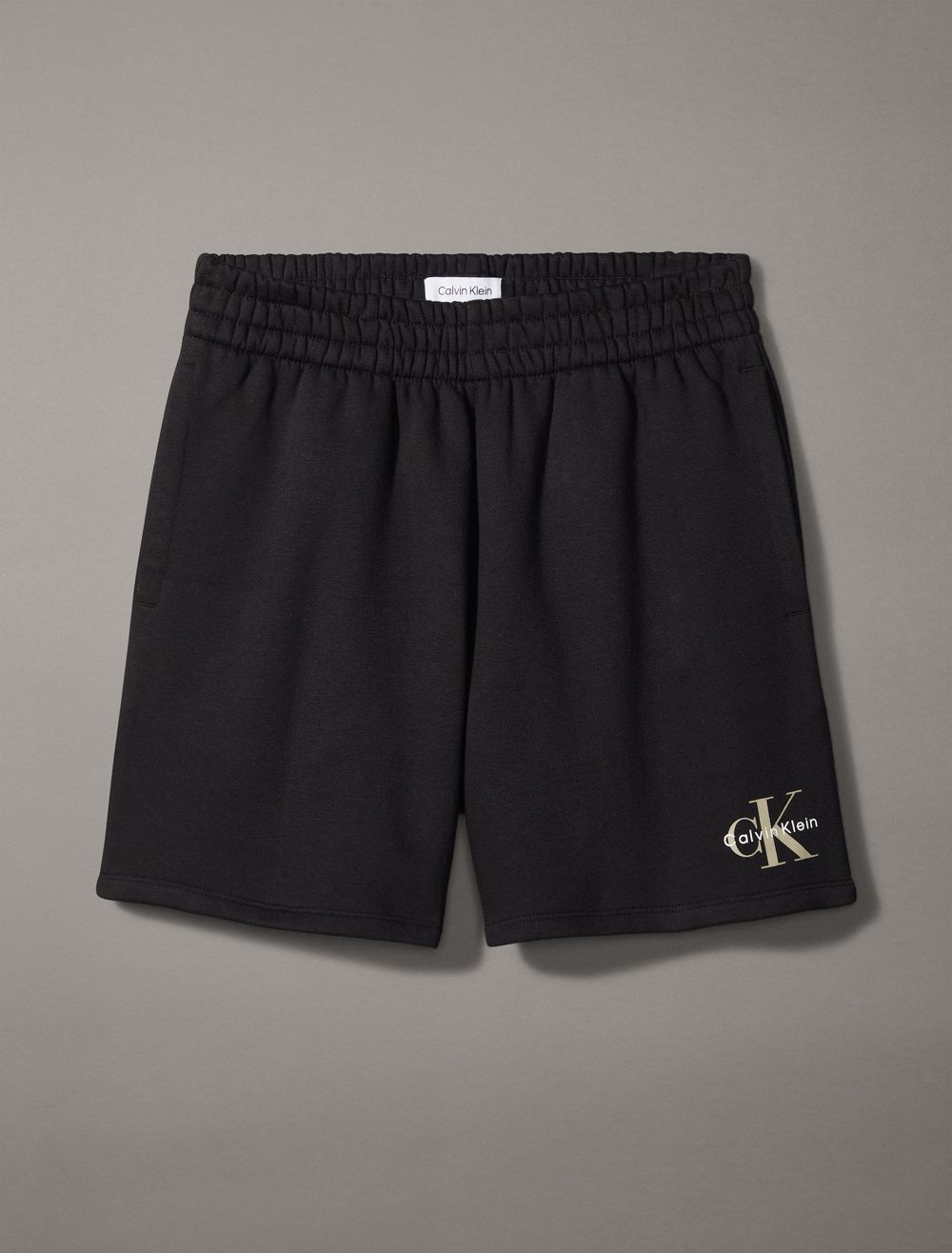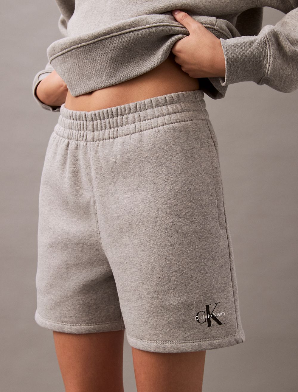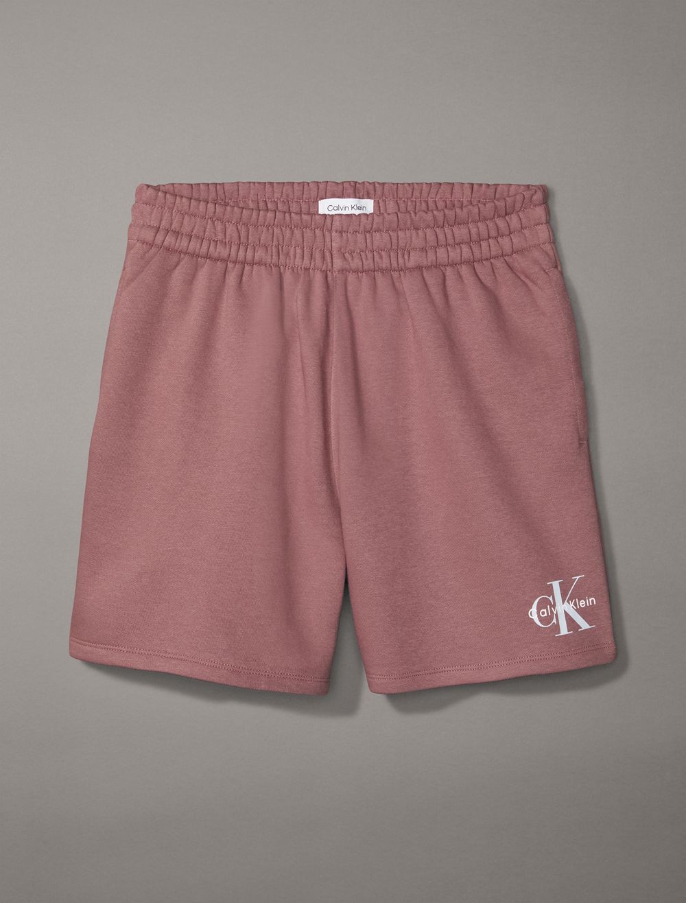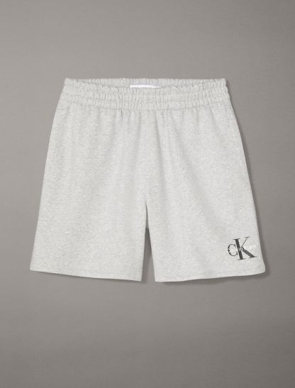 Crafted from cotton fleece, these shorts feature an ultra-soft feel for extra comfort. Made with a drawstring waistband and slip pockets at the sides. Finished with seaming details and CK monogram logo styling near the hem.- High rise waist
