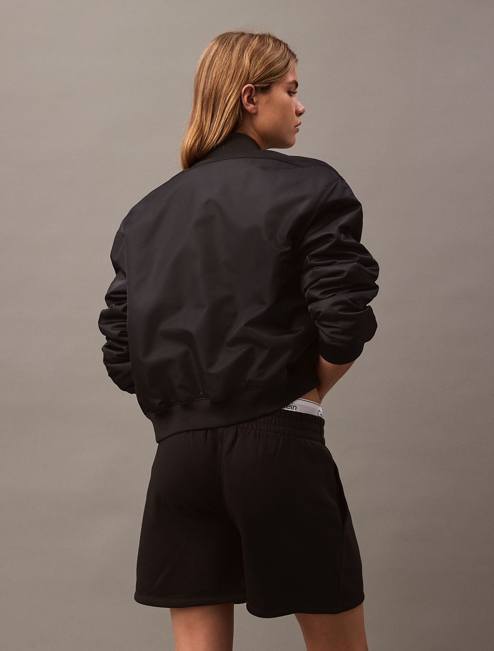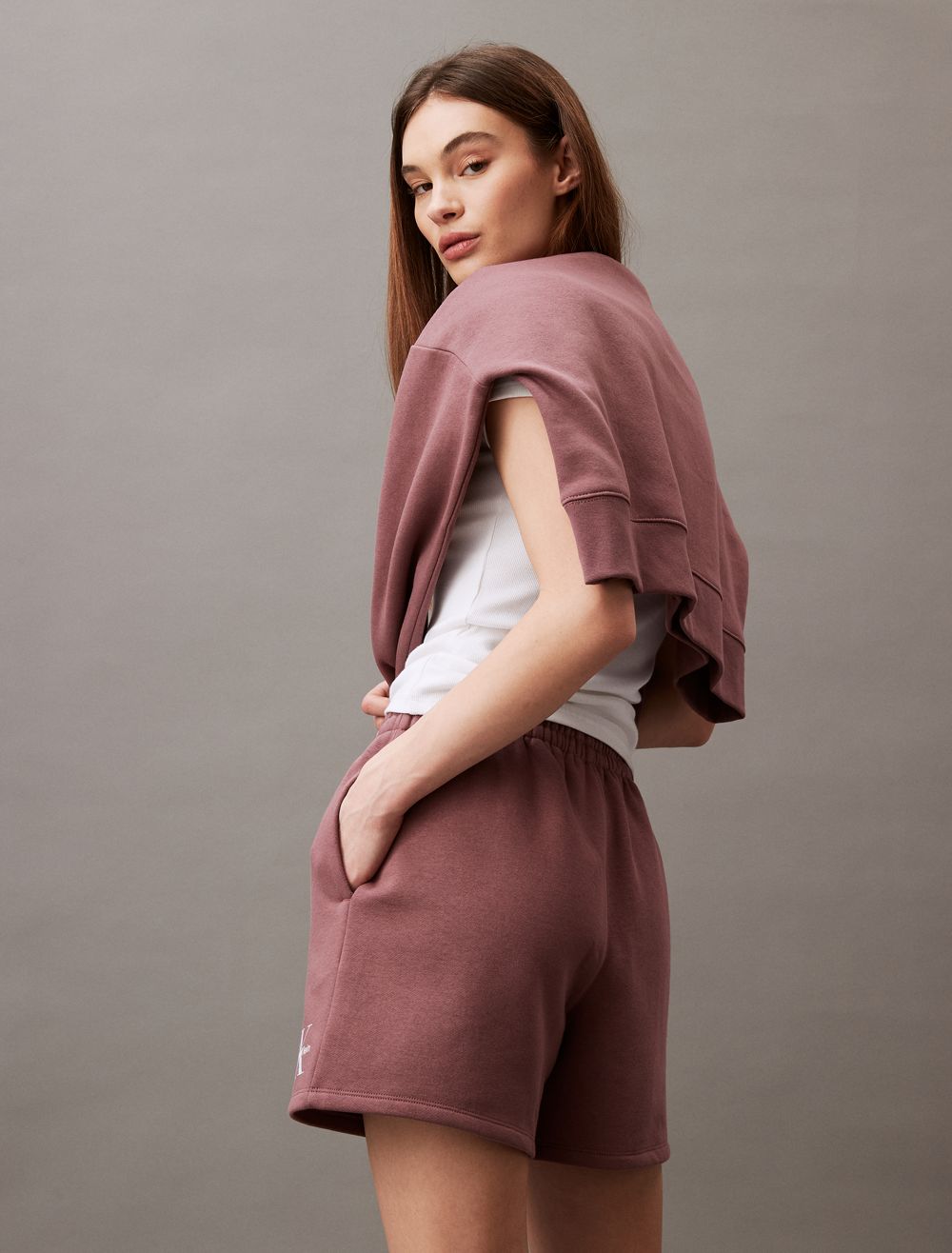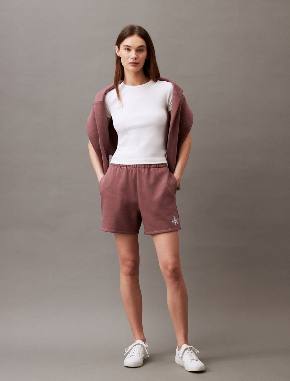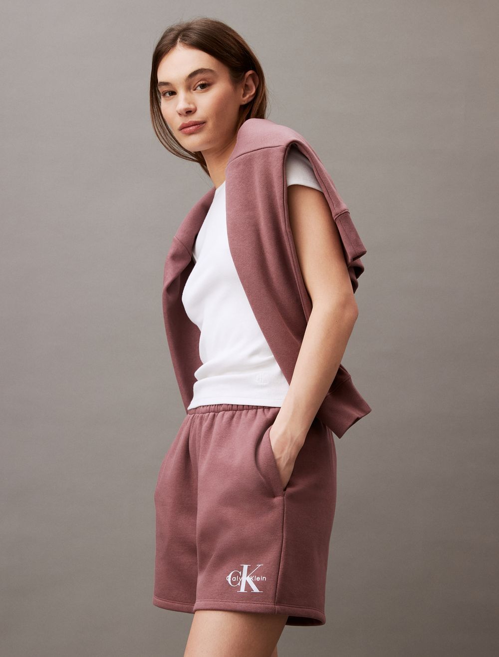 Crafted from cotton fleece, these shorts feature an ultra-soft feel for extra comfort. Made with a drawstring waistband and slip pockets at the sides. Finished with seaming details and CK monogram logo styling near the hem.- High rise waist