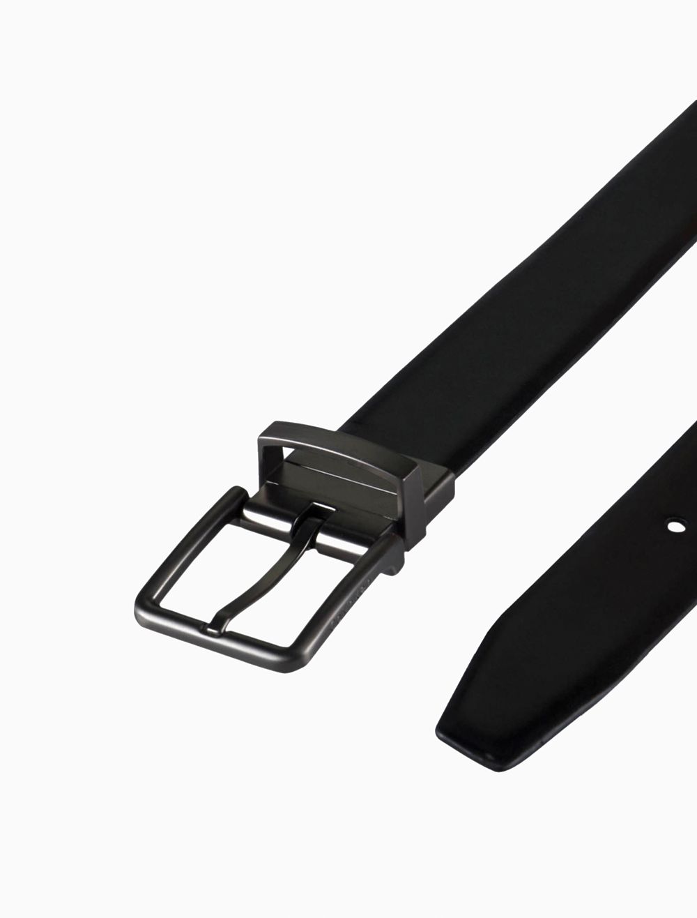 A great addition to your accessory collection - this sleek and modern dress belt features a strap that reverses from smooth leather to textured saffiano for versatile wear. Finished with an engraved logo application on the matte gunmetal swivel buckle.- Classic single prong harness buckle