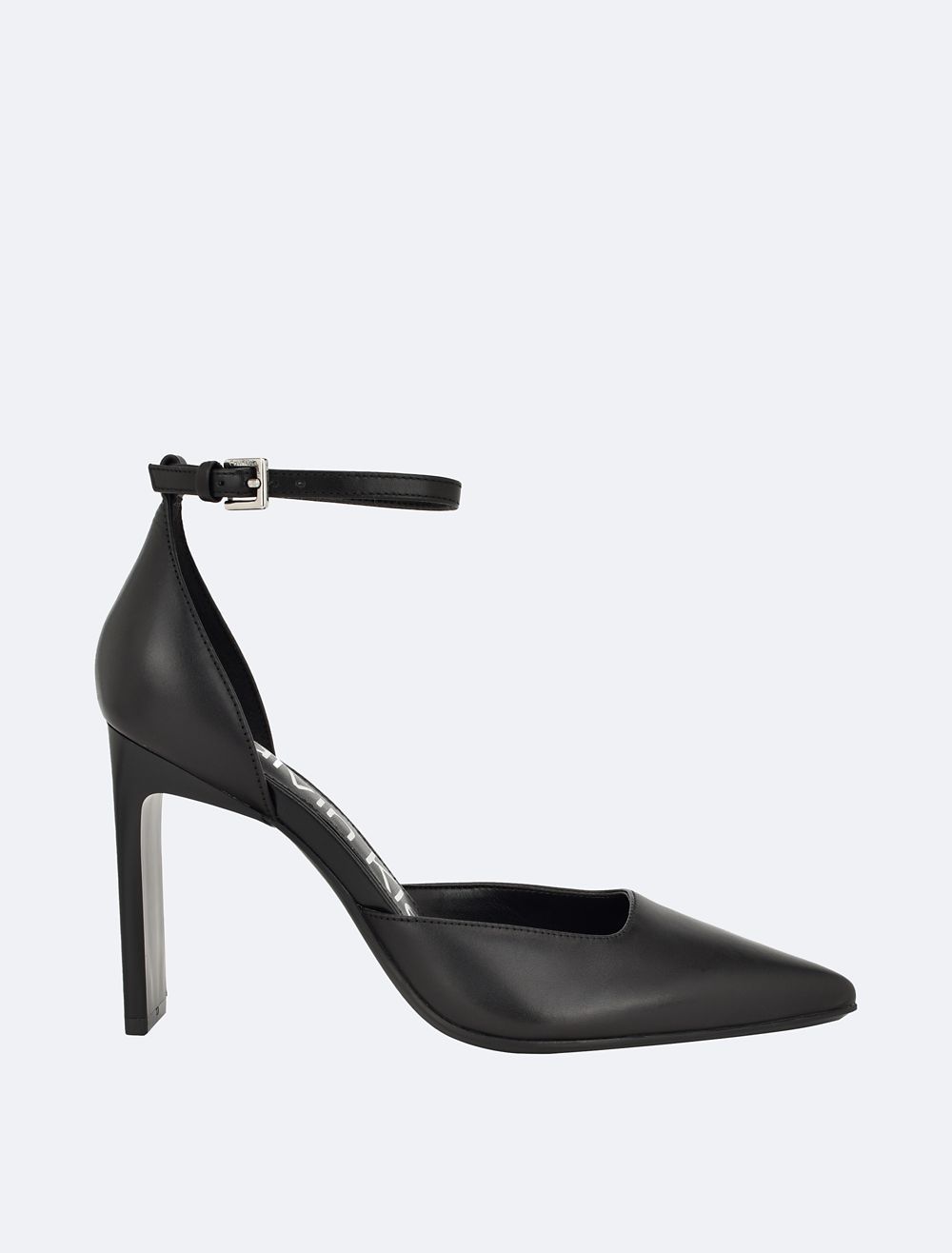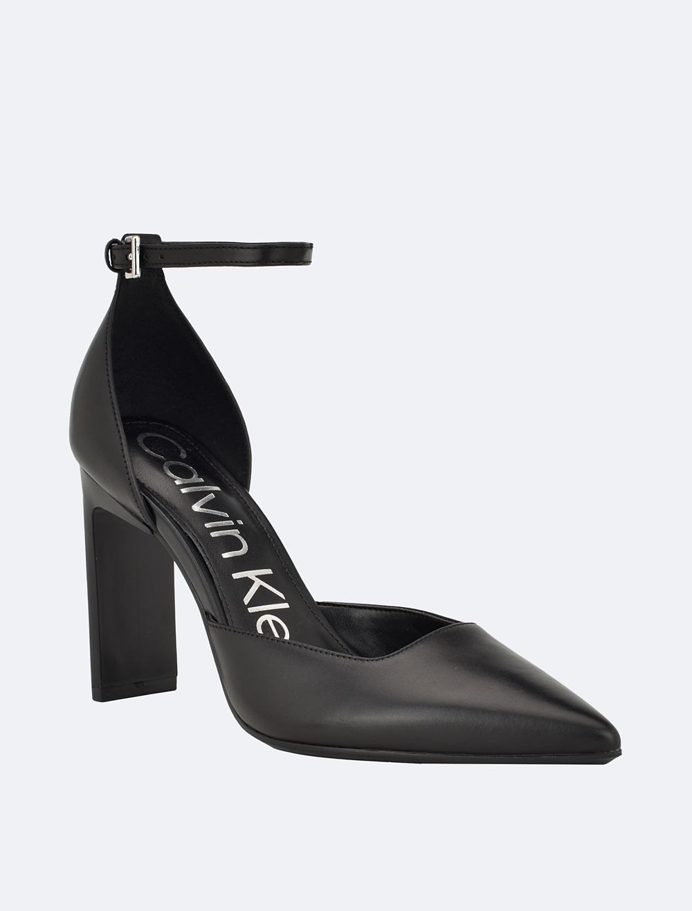 A classic night-out silhouette, this dress pump is designed with a rectangle heel and a sharp point toe. Made with an adjustable ankle strap detailed with a buckle closure for a personalized fit. Features CK logo styling at the footbed.- Rectangle heel