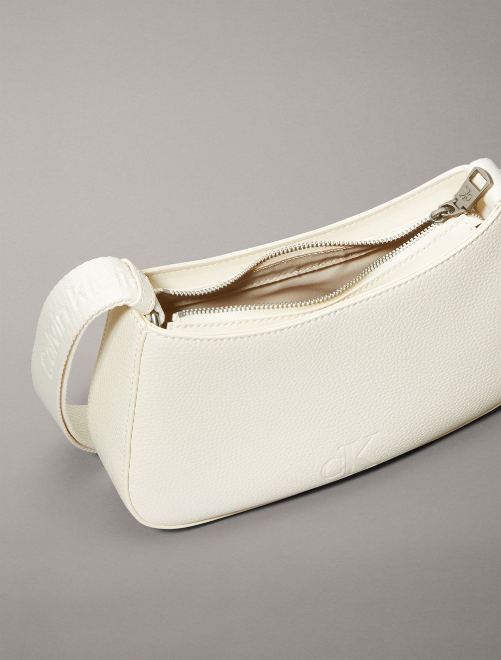 A versatile essential for everyday wear, this shoulder bag features solid, minimal styling. Made with a zip closure at the top and an adjustable shoulder strap for a personalized fit. Finished with CK logo styling along the shoulder strap and an embossed CK monogram logo at the front.- Zip closure at the top